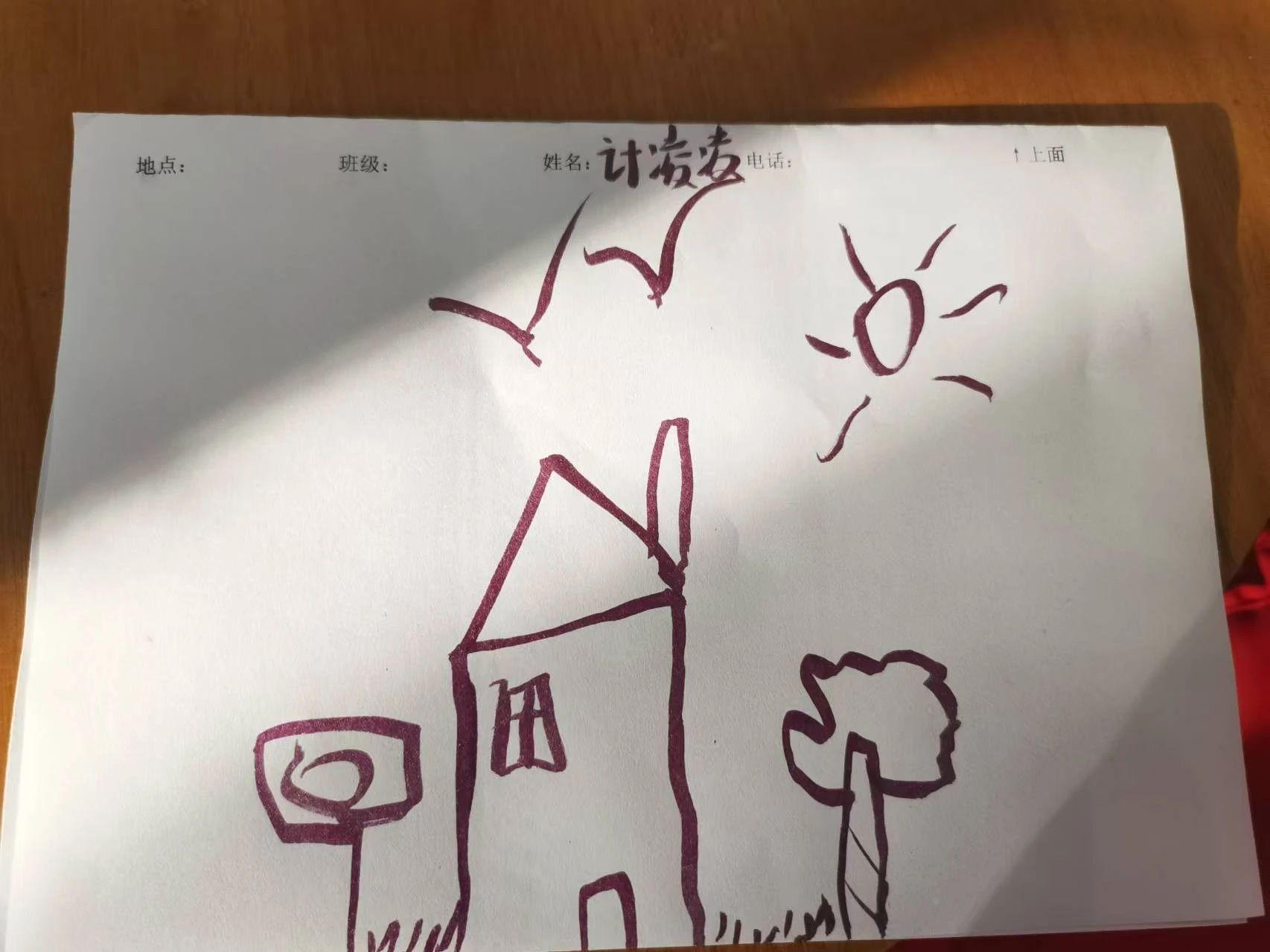 这幅简单的插画中,包含具象物体如房屋、树木和太阳,以及两个飞翔的小鸟。房屋的形状简单,线条粗犷,树木呈现卡通化的样式。太阳和鸟以简单的线条表现出一种稚拙的艺术风格。这些元素共同构成一个宁静的乡村场景,体现出平和与自然的感觉。
