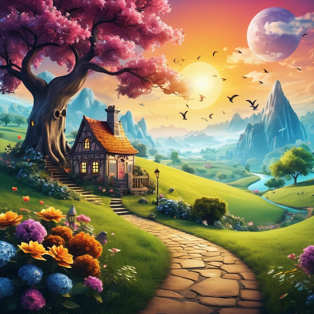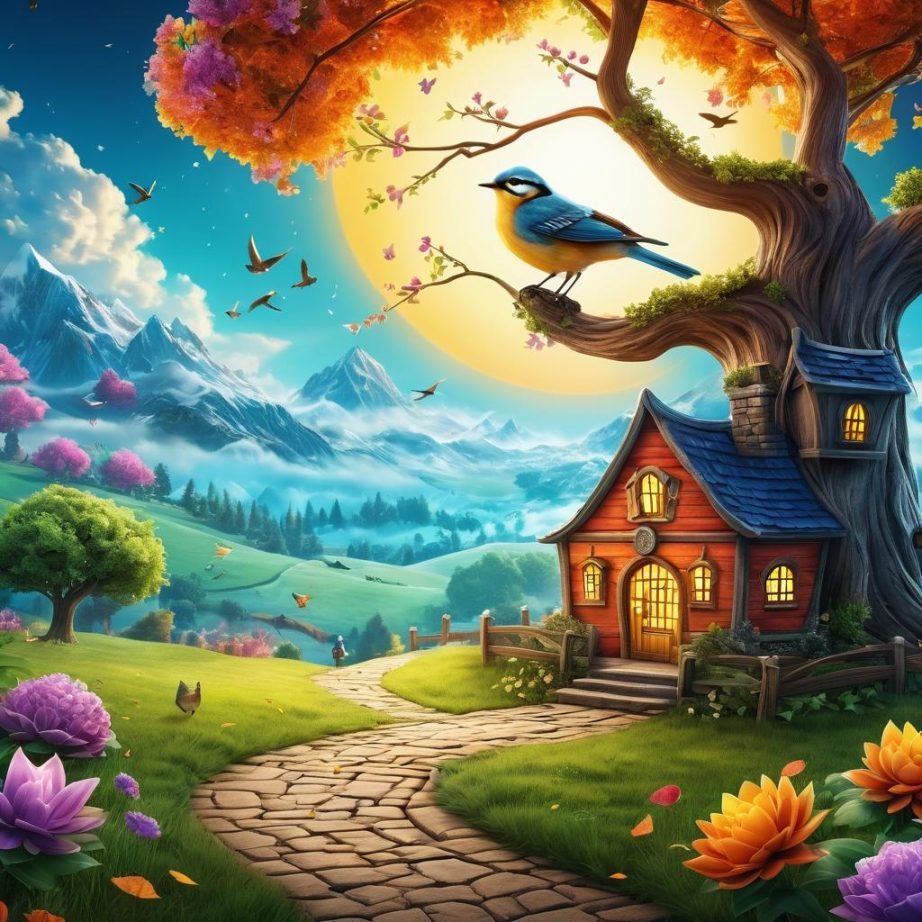 可以将太阳赋予故事性,使其成为一个魔法太阳,能够赋予生命;飞翔的鸟可以是传递信息的使者,树木则可能是通往另一个幻想世界的入口。通过细化这些元素,丰富场景的故事性。