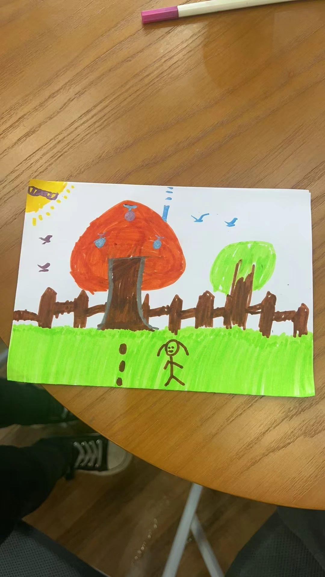 这幅插画展现了一位站在草地上的人物,背景是两棵树和围栏。太阳和飞鸟增加了画面的生动感。大树的红色树冠和绿色草地形成鲜明对比,简单的线条和色块构成了一种童趣风格。