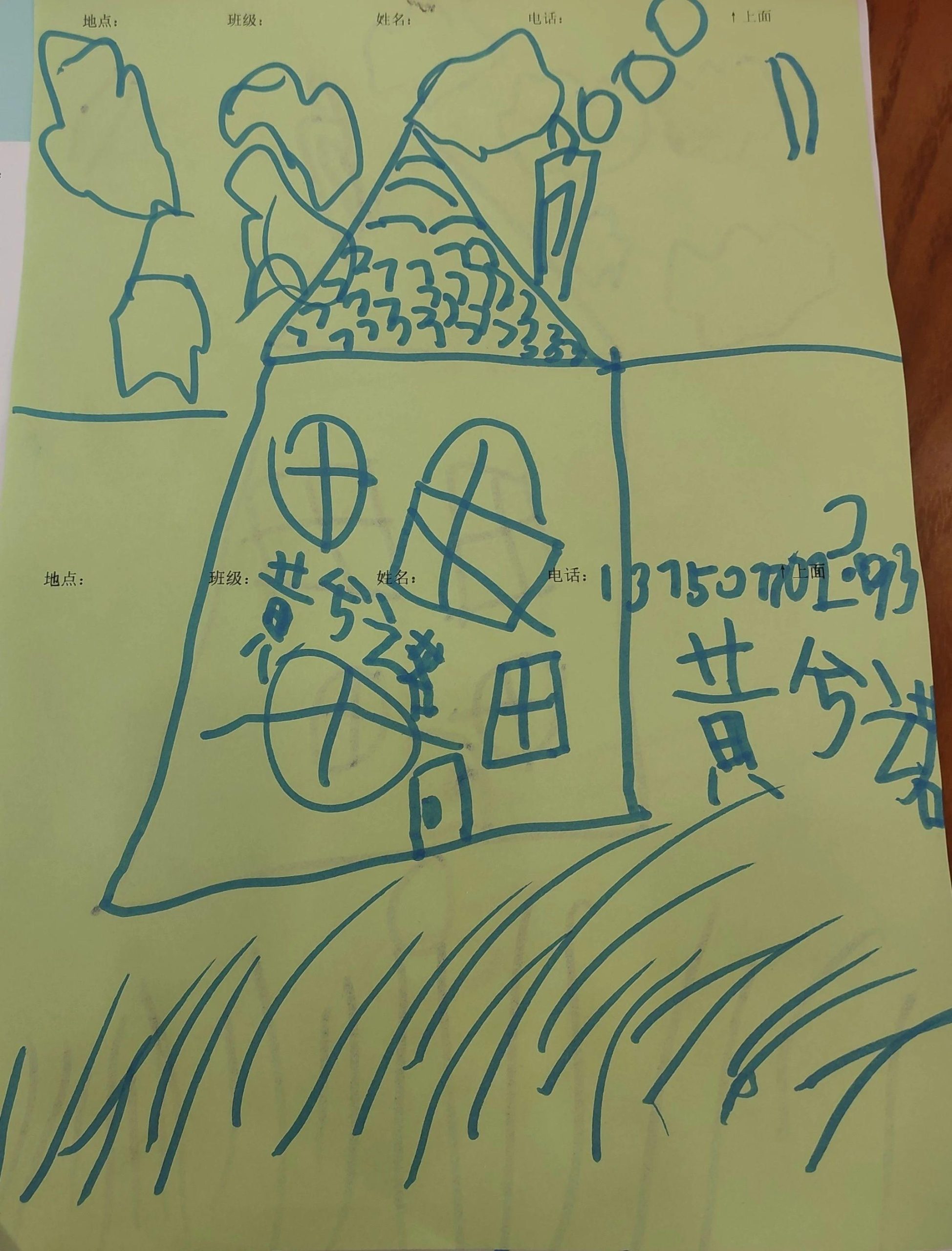 这幅画展示了一座房子,具有圆形窗户和一个带有图案的屋顶,周围有抽象的树木和曲线草地。房子的设计简单、线条粗犷,呈现出童趣的风格。图中的文字和数字增加了趣味性的元素。