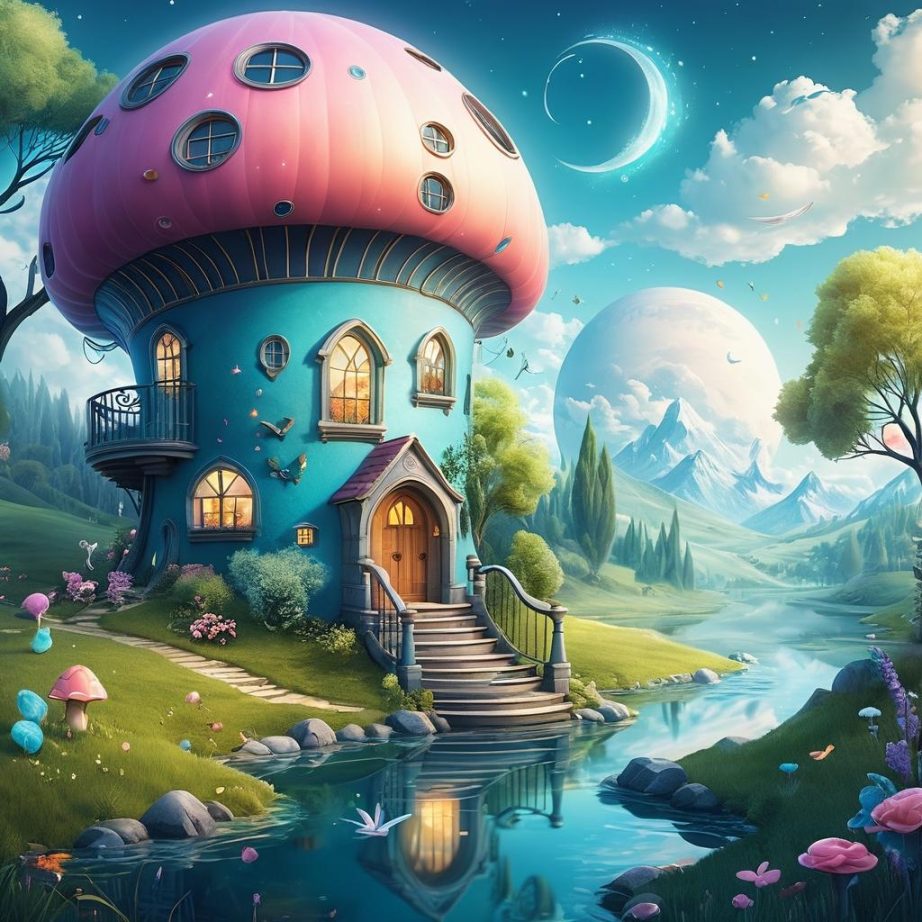 可以将房子设计成一个神奇的建筑,窗户发出柔和的光,周围树木变成会移动的幻想生物。屋顶上的图案可以转化为魔法符号,增强神秘感。