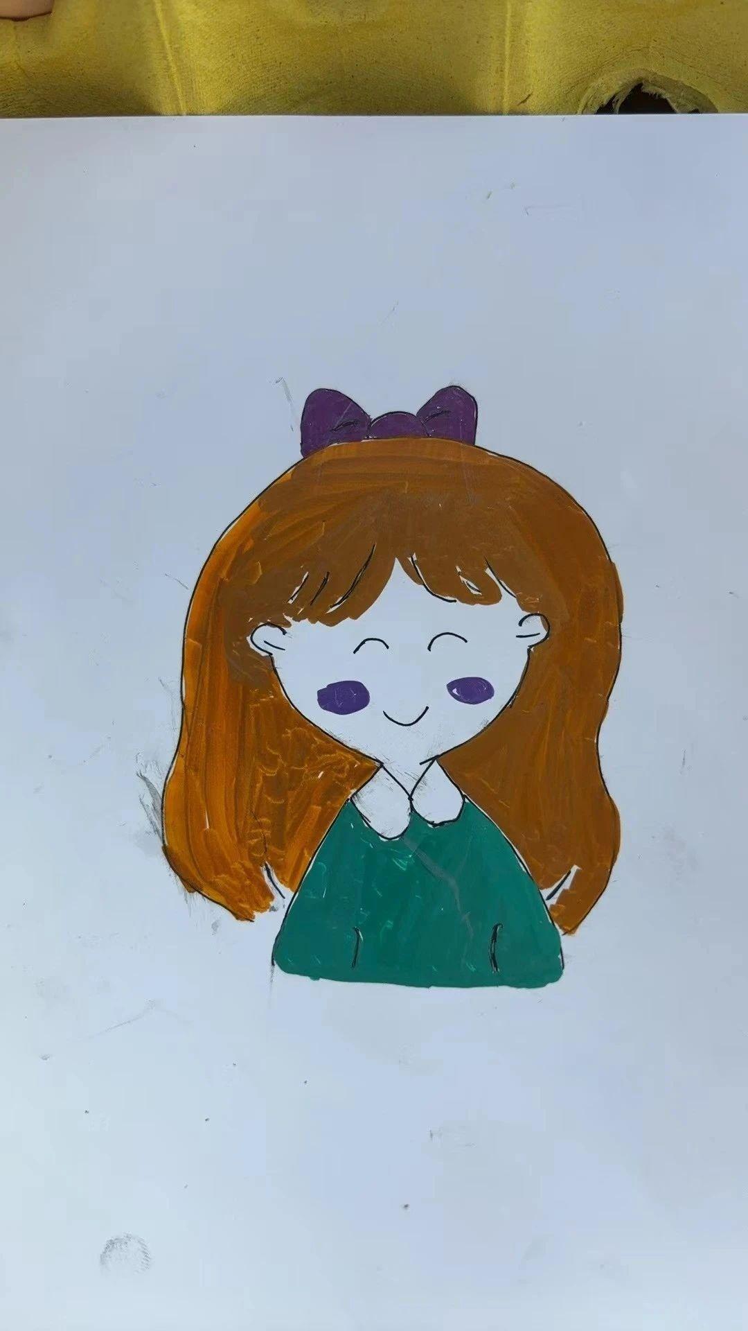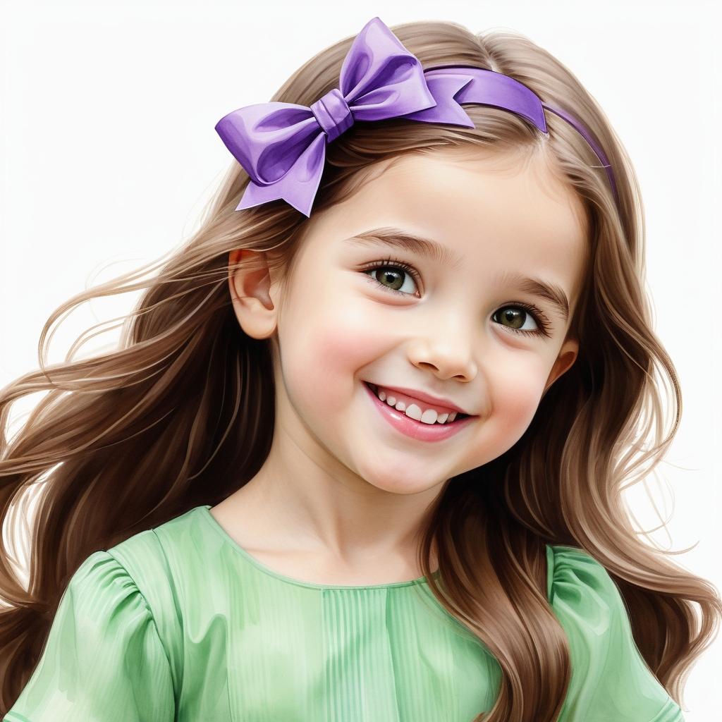 这幅画展示了一个简约卡通风格的女孩形象。主体是一个长发女孩,配有紫色蝴蝶结和绿色衣服。画作采用了简单的线条和柔和的色彩,传递出一种纯真和快乐的情感。背景为纯白色,使得主体更加突出。