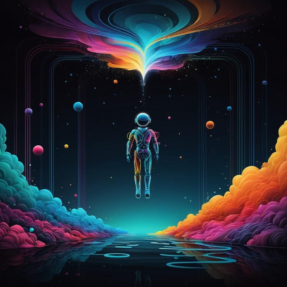 这幅作品使用了简单的线条和色彩,可能是儿童的创作。画面中有一个人形轮廓,周围有不规则的线条和形状,可能象征着自然元素如植物或水流。整体色调偏暗,以彩色线条为主,给人一种梦幻或探索的感觉。