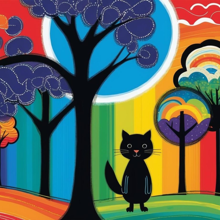 这幅作品使用了简单的线条和明亮的颜色,描绘了一只看似幻想中的动物和两棵树。整体风格充满童趣和想象力,线条流畅且富有表现力。创作者可能试图传达一种纯真和自然的主题。