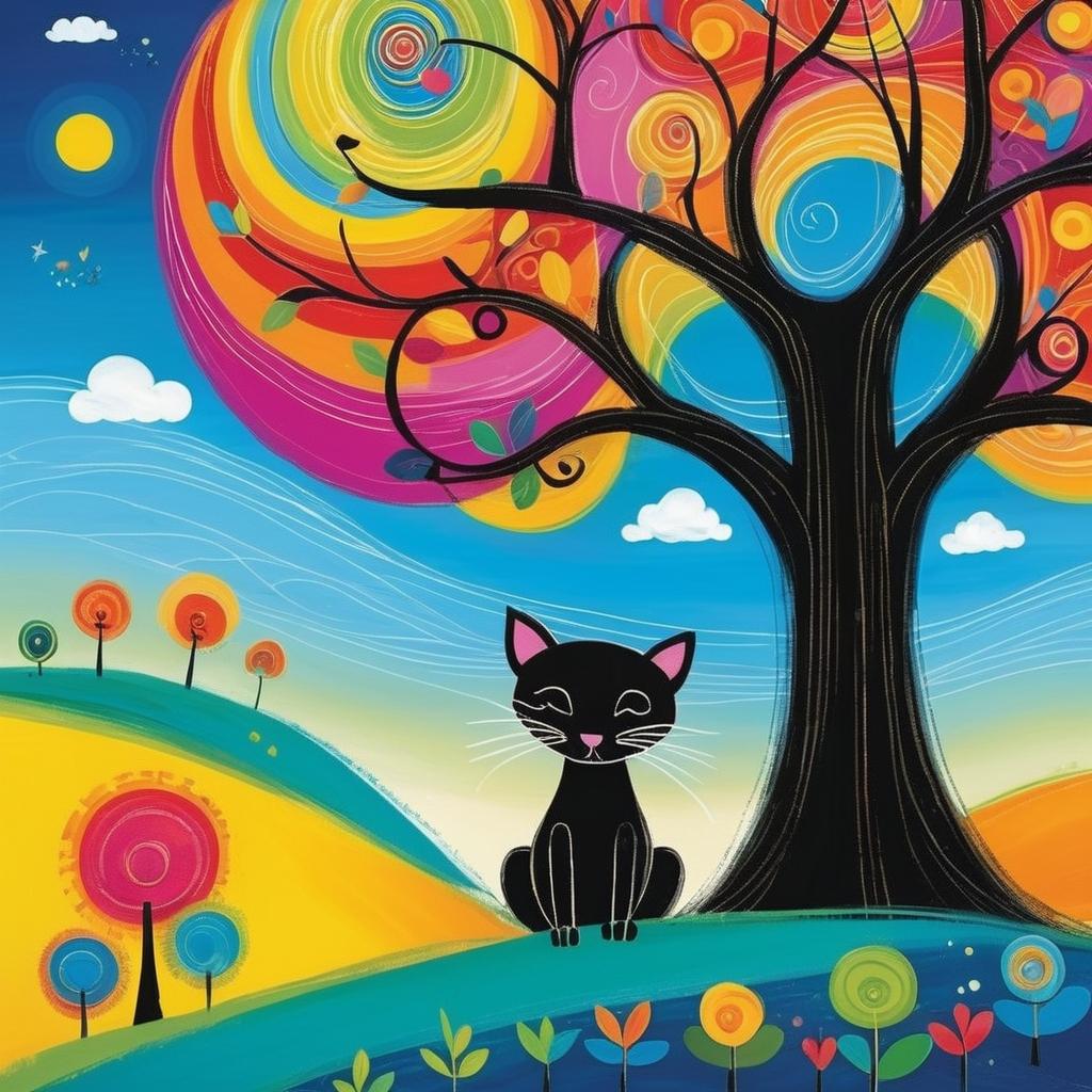 这幅作品以简单的线条和鲜艳的颜色捕捉了孩子般的想象力。它展现了一种天真无邪的风格,带有强烈的个性化表达。为了进一步提升这幅作品,可以考虑增加背景细节,以丰富图画的故事性和情感深度。例如,可以加入更多的自然元素,如云朵、太阳或其他动物,使画面更具活力。此外,利用渐变色彩可以增强画面的层次感和视觉冲击力。通过这些细节的增加,作品将不仅仅是简单的线条画,而是一个充满生动故事的艺术作品。