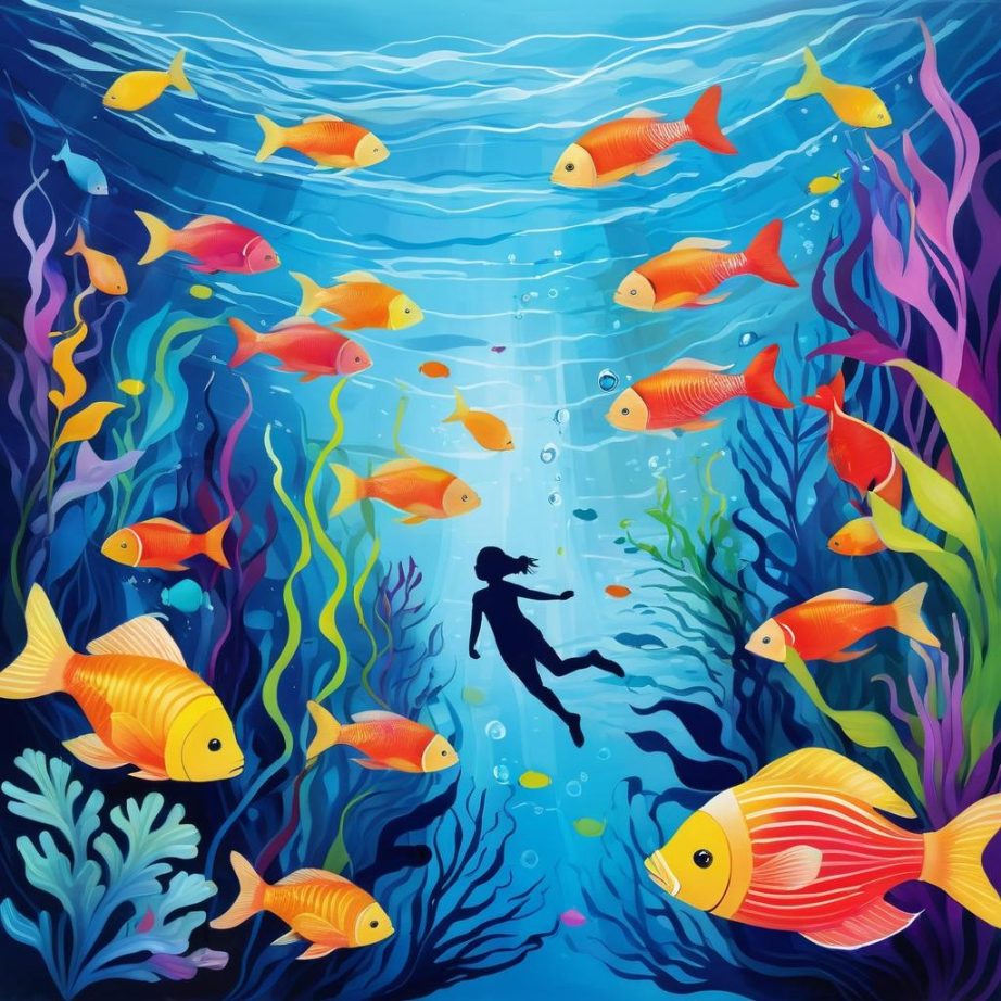 这幅作品以其简单而色彩缤纷的表现手法,充满了童趣和想象力。通过简约的线条和色彩,将人物置于一个充满生机和活力的水下世界中。可以进一步提升这幅作品的情感表达,通过在背景中加入更多的海洋生物和植物细节,丰富画面的层次感。此外,使用不同的色彩深度来表现水的流动性和透明感,可以让画面更加生动。通过这些细节的增强,作品将更加引人入胜,能够更好地传达自然的美好与生命的活力。