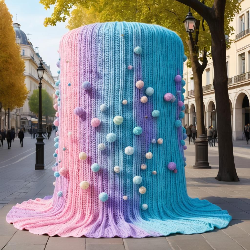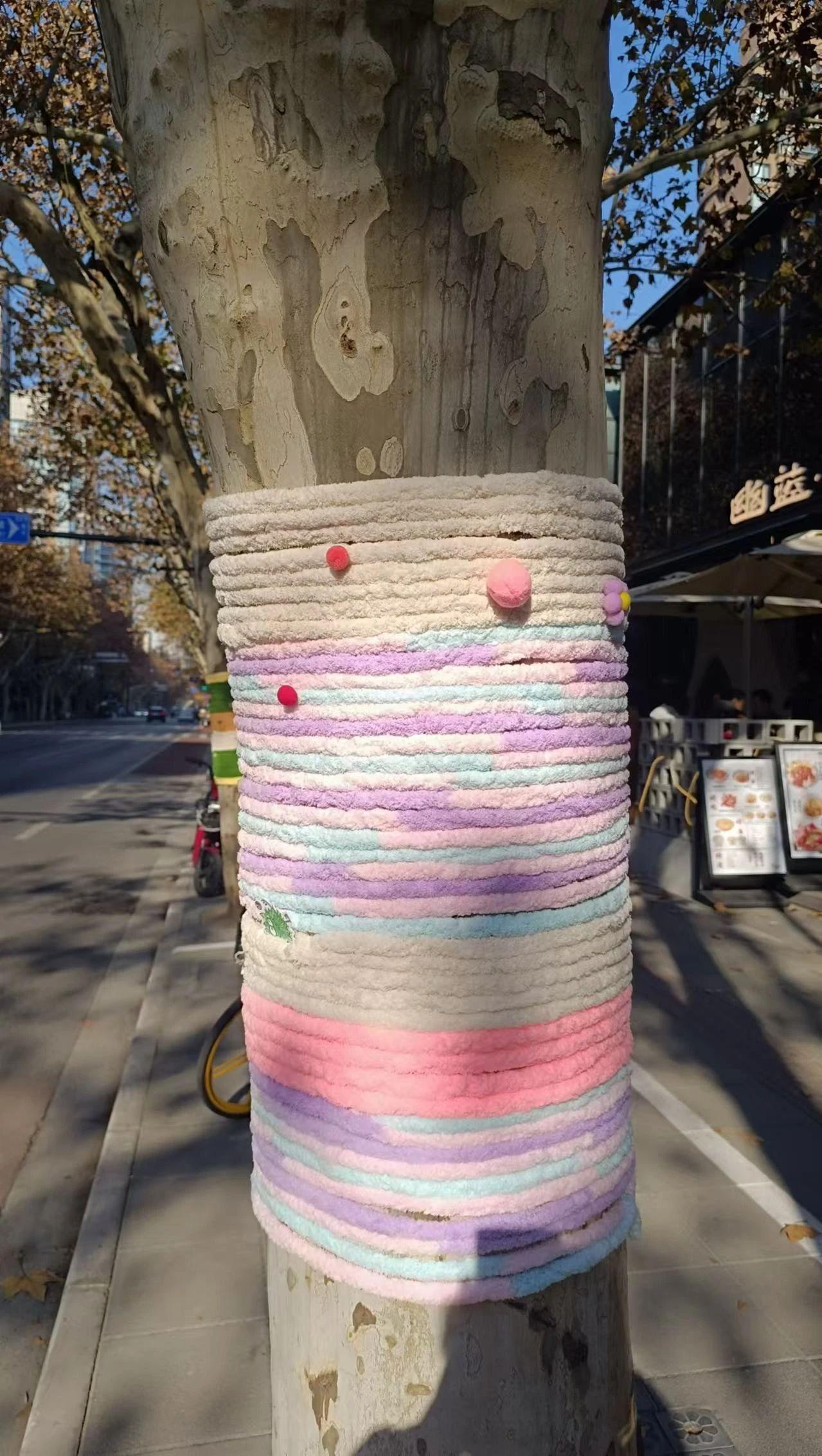 这张图片展示了一棵树干被柔和的粉色、紫色、蓝色和白色的针织物包裹着,表面有几颗小球装饰。背景是城市街道,光线明亮,营造出一种温暖和谐的感觉。作品可能传达了一种保护自然或为城市增添趣味的主题。