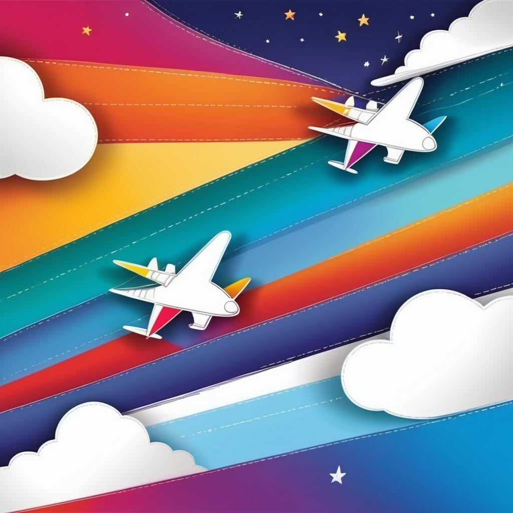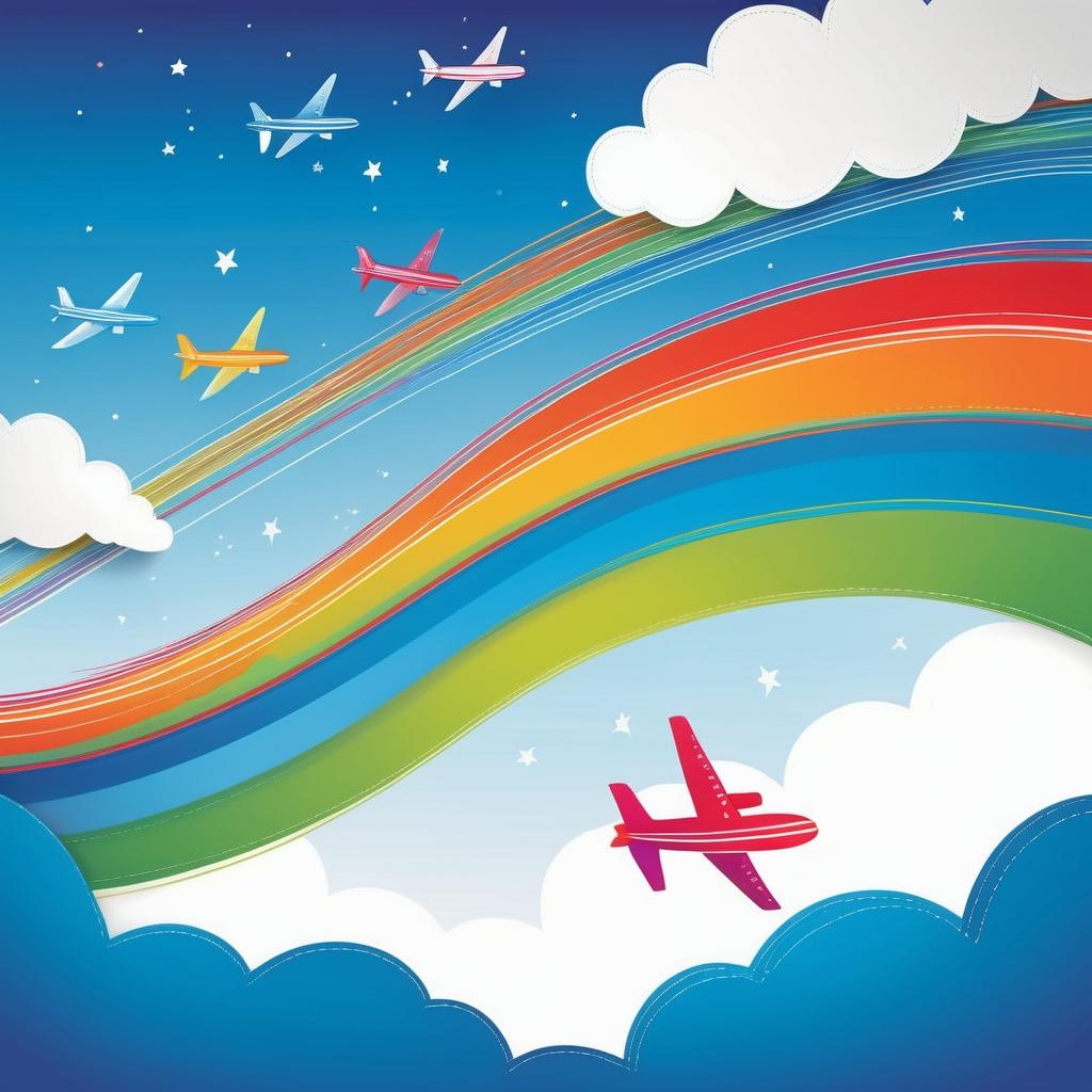 这幅作品以简洁的线条与明亮的色彩勾勒出飞机的形象。背景中还有抽象的曲线和形状,暗示了飞行的动感与速度。整体画面给人一种轻松自由的感觉,似乎在表达一种对飞行和探索的向往。