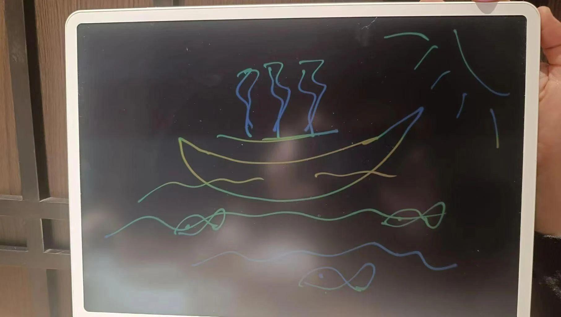 这幅手绘作品展现了一艘船漂浮在水面上,背景有太阳,以及几条鱼游动。整体线条简单而流畅,色彩明亮,给人一种轻松愉快的感觉。船的形状和水波的线条形成微妙的动态平衡,颜色的运用则为作品增添了活力。