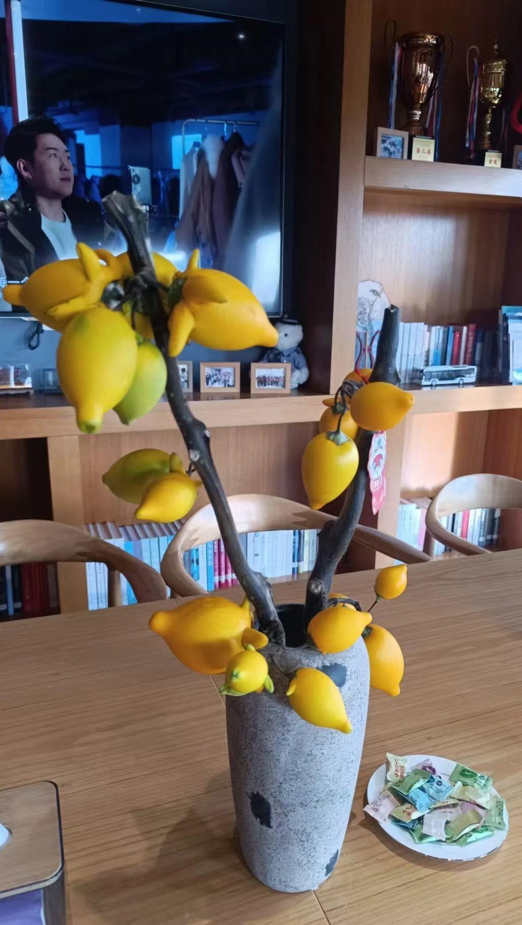 这张照片展示了一个放置于室内桌面上的花瓶,花瓶中插有几枝黄色果实造型的装饰。背景中有书架和电视,营造出一种居家的氛围。果实的黄色与花瓶的灰色形成鲜明的色彩对比,增强了视觉冲击力。整体构图简洁,果实的排列具有一定的节奏感,色彩的明亮与背景的温暖色调形成和谐的对比,传达出一种轻松和愉悦的情感。