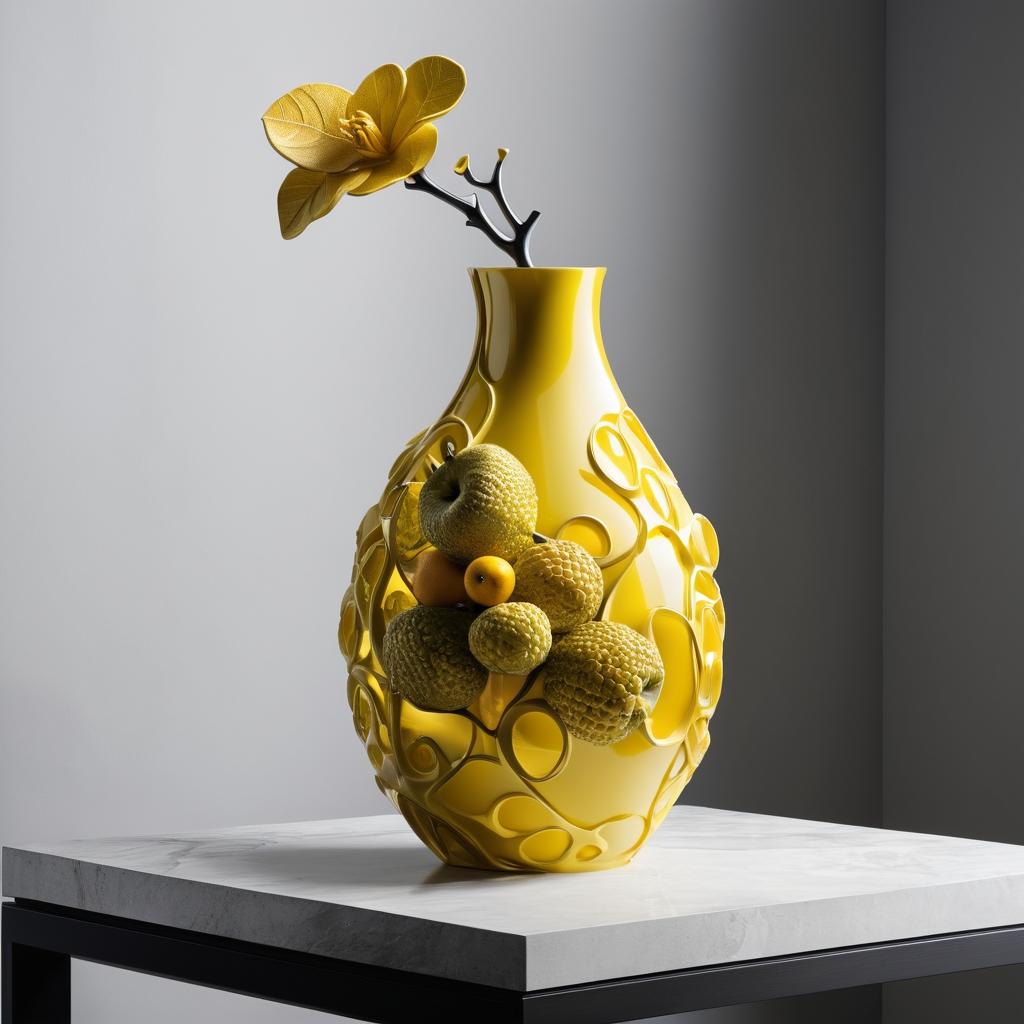 该作品可以转化为一件自然启发的装饰性雕塑。果实的形状可以在雕塑中作为主要视觉元素,采用抛光金属或彩色玻璃材质以增加光泽和透明感。花瓶的质感可以通过使用粗糙的石材或混凝土来体现,强调对比的触感。雕塑可以设计为一组模块化的作品,允许观者自行组合,形成不同的视觉效果,进而丰富空间表现力。