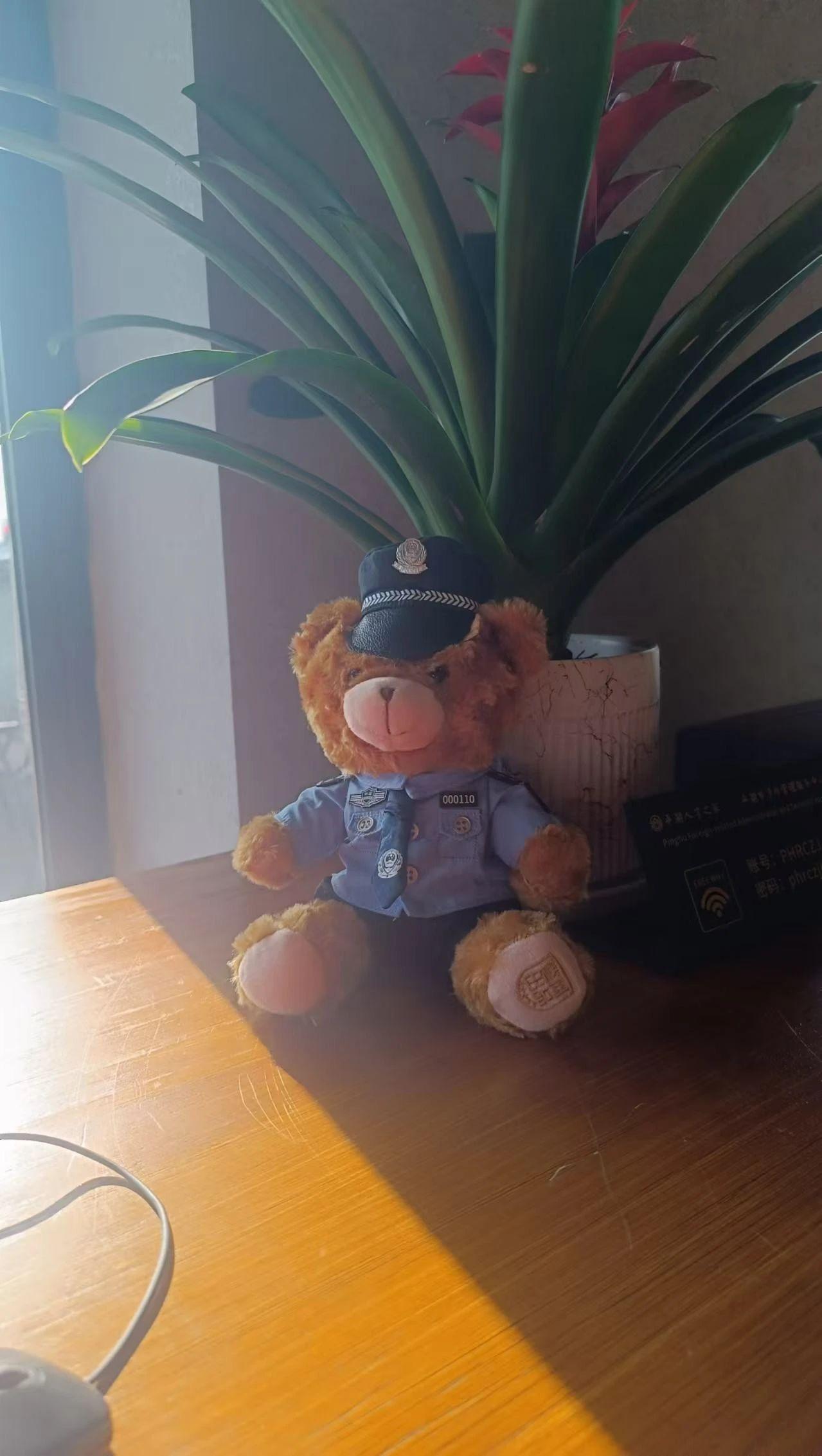 这张照片展现了一只穿着警服的泰迪熊坐在桌面上,背后是绿色的植物和阳光透过窗户洒下的光影效果。照片的构图简单,泰迪熊成为视觉中心,柔和的自然光给予整个画面一种温暖和宁静的氛围。光影在桌面上形成的斜线增加了画面的动态感,背景中的植物为整体增添了一丝生机。