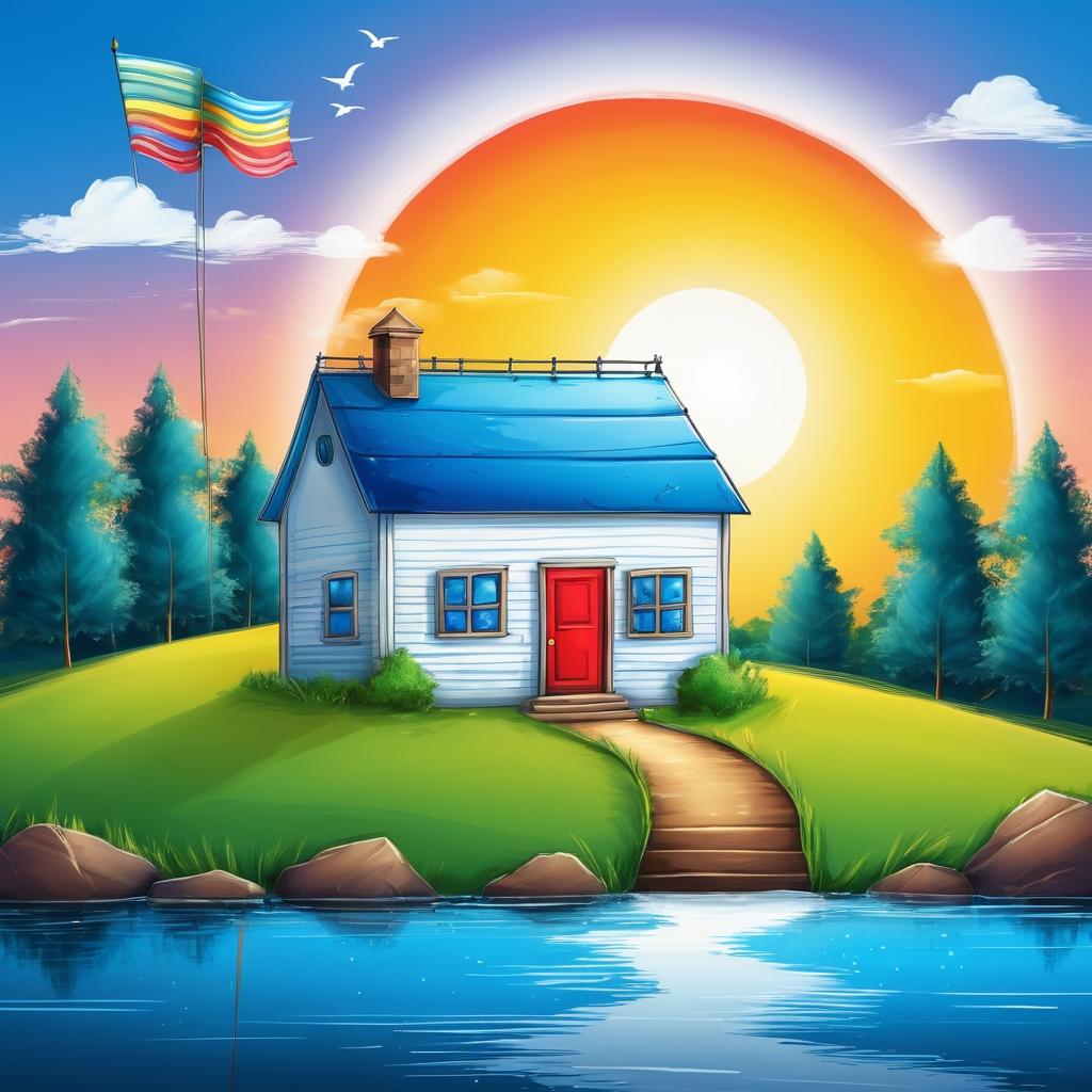 这幅画运用了简单的线条和色彩,描绘了一个房子、树木、太阳和云朵。画面整体充满了童趣,表达了一种宁静和快乐的田园生活。色彩的选择明亮而富有活力,似乎传达了对自然和家的爱。