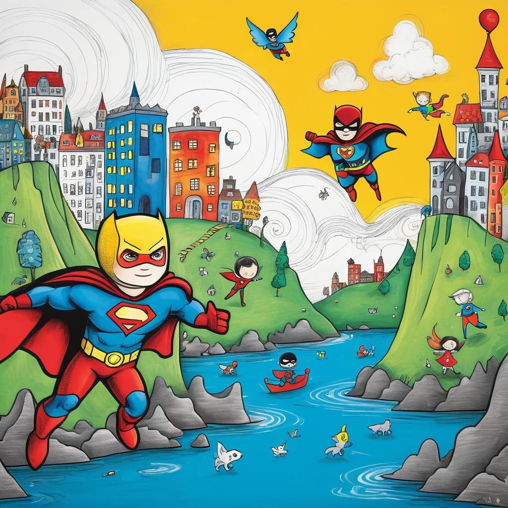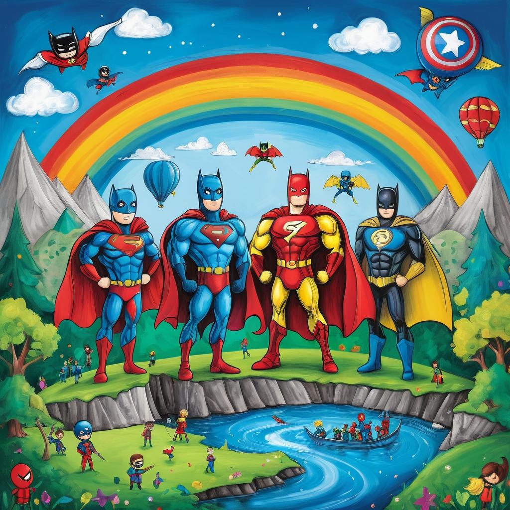 这幅作品以天真无邪的风格展现了儿童眼中的对抗与合作。左侧的英雄形象与右侧的团队构成鲜明对比,体现了孩子们对角色扮演游戏的热爱。可以尝试通过增加背景元素来丰富画面故事,例如添加一个幻想中的战斗场景或是一个充满奇幻色彩的背景。通过多样化的色彩运用,可以增强角色之间的情感冲突,使整个作品更具视觉冲击力。这样的调整将使作品更具深度,能够吸引观众的注意力并引发更多的情感共鸣。