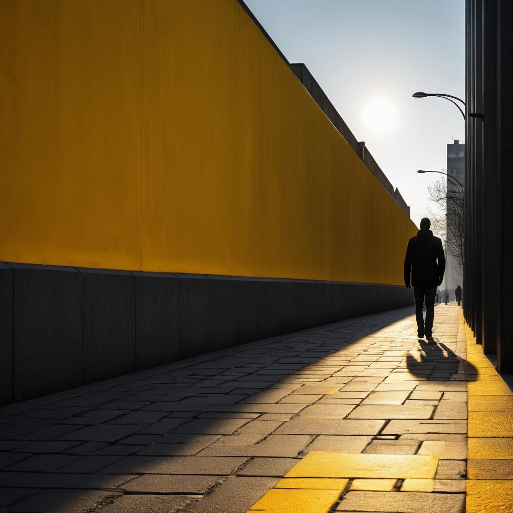 这幅作品通过简单的影子和色彩对比,传达了日常生活中的艺术美感。创作者巧妙地利用光影与构图,使背景中的黄色盲道成为视觉焦点,增强了作品的几何美感。为了进一步提升艺术性,可以尝试在影子的形态上进行更抽象的表达,或是利用后期处理增强色彩对比和光影效果,使作品更具视觉冲击力和情感深度。将此作品置于城市环境中,辅以更多的街头元素,如行人、车辆等,可使其更具动感和现代感。
