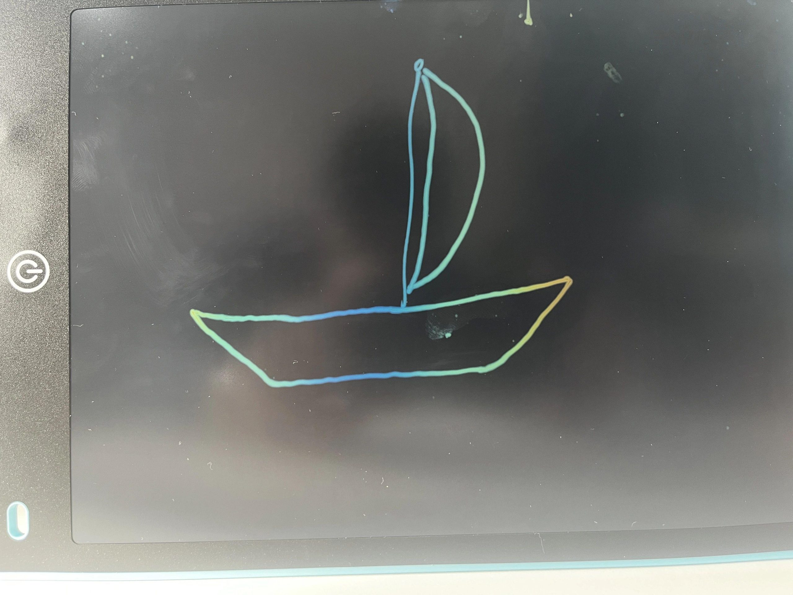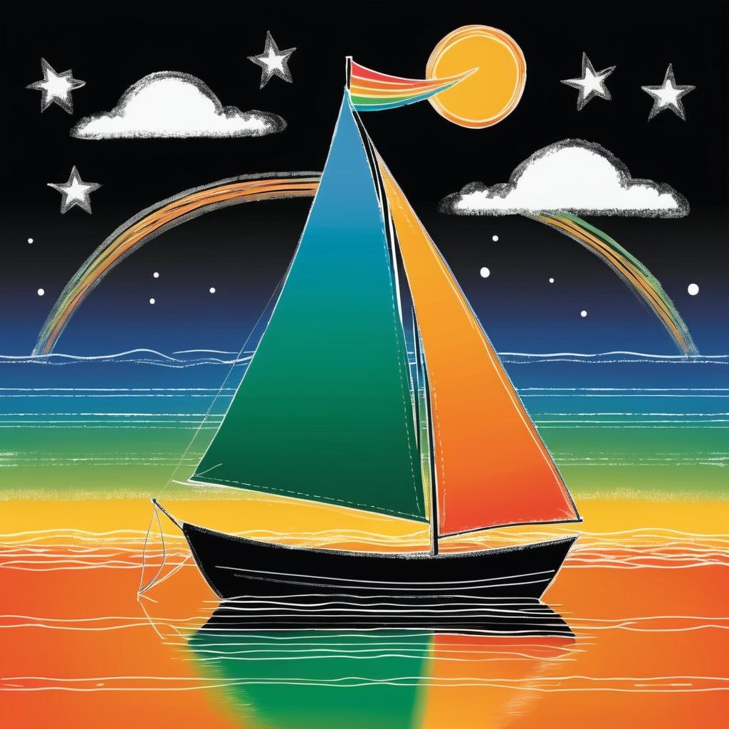 这幅图像展示了一艘用简单线条勾勒的小船。线条呈现出一种彩虹色调,从绿色到橙色的渐变。图片背景是黑色的,这使得彩色线条更加突出。整体构图简洁,给人一种纯净和自由的感觉,可能表达了一种对航行和探索的向往。