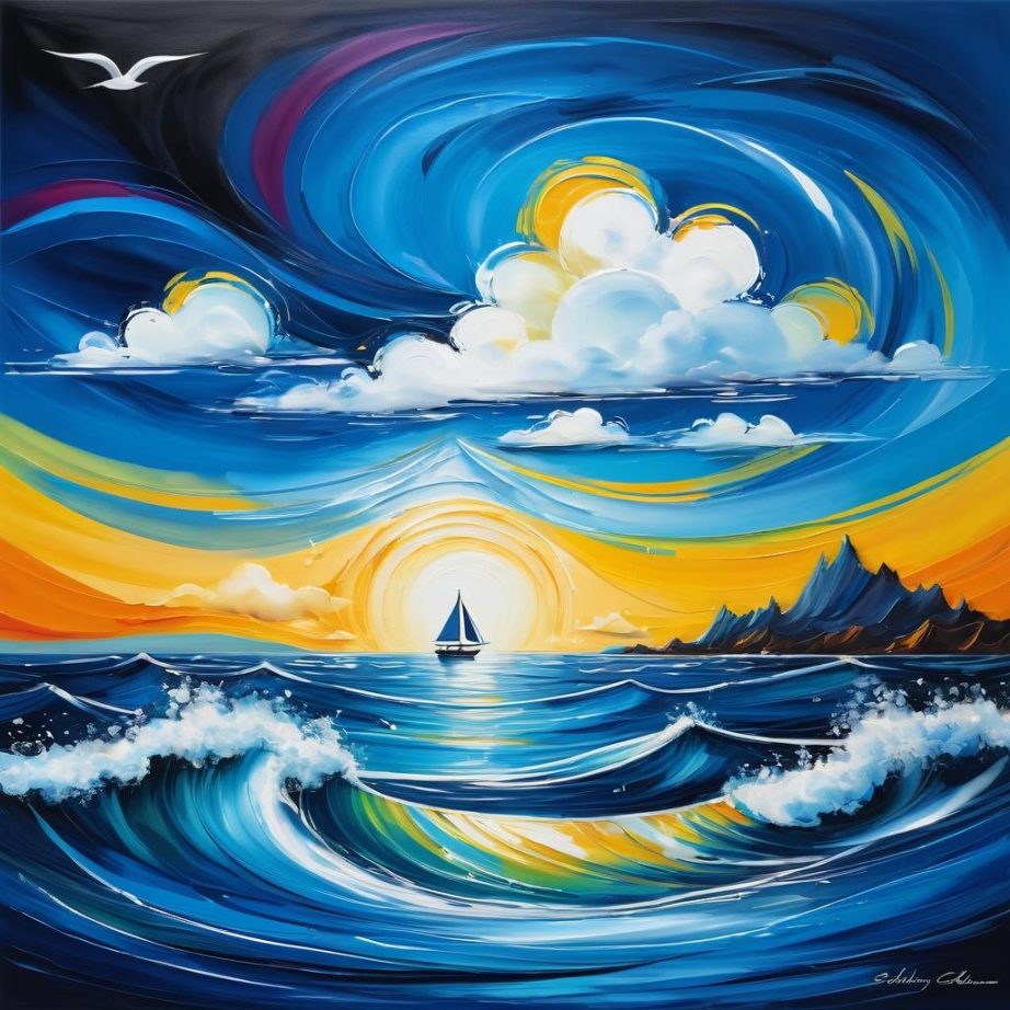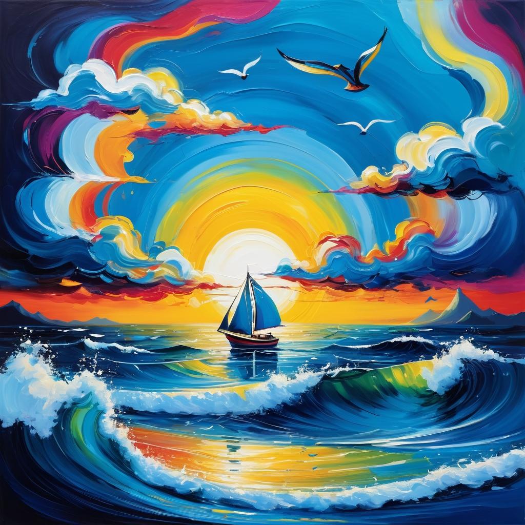 这幅作品以简单的线条和明亮的色彩描绘了一艘在风浪中航行的小船。背景中有抽象的云朵和波浪,以蓝色和黄色为主色调,营造出一种活泼而动感的氛围。画面的构图以船为中心,周围的波浪和云朵形成了自然的框架,传达了一种冒险与自由的精神。