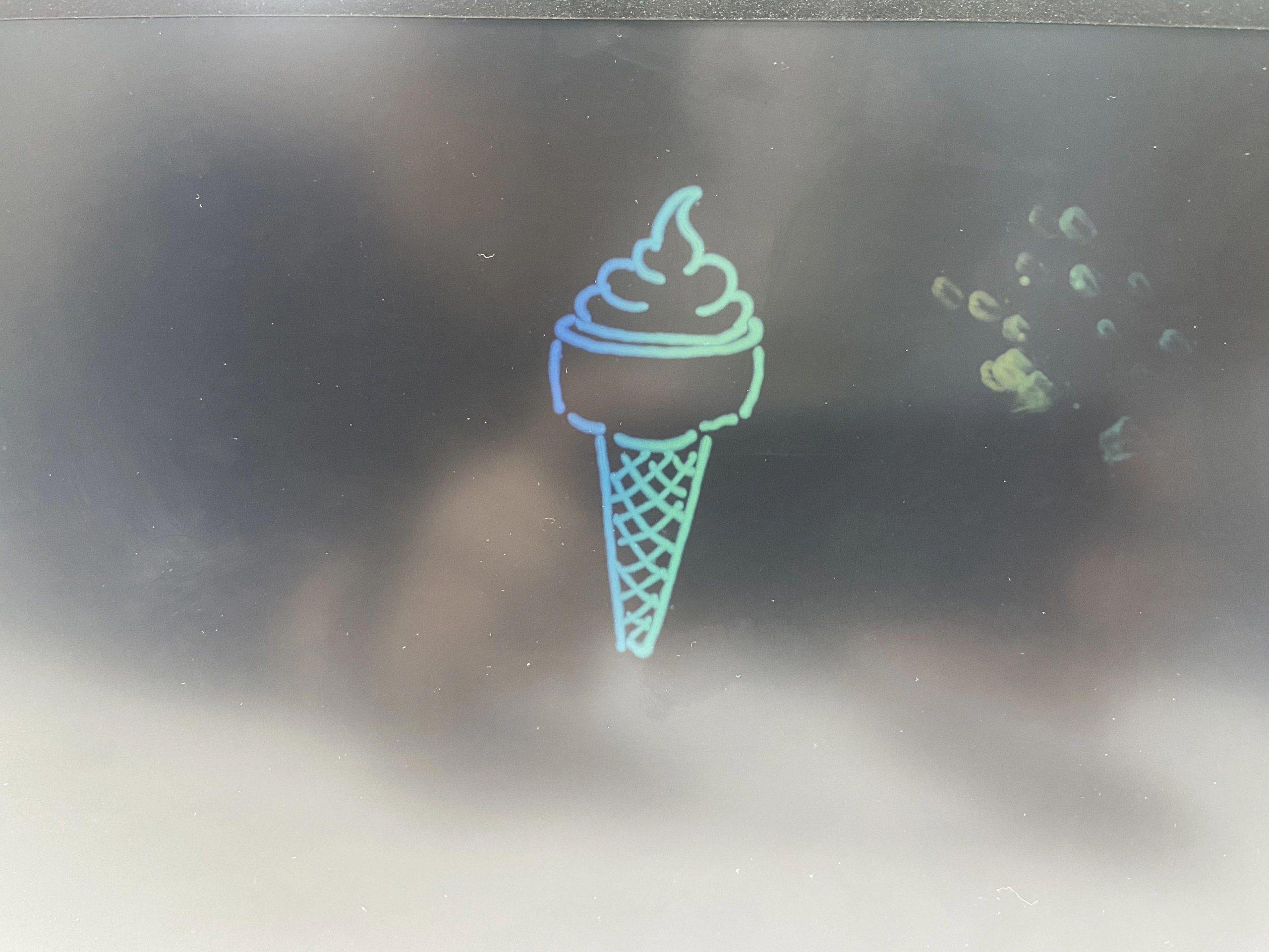 这幅作品是一幅简洁而富有童趣的手绘草图,描绘了一个冰激凌甜筒。线条流畅,形状简单而明快,整体构图具有轻松和欢快的氛围。颜色运用了柔和的渐变,给人以清爽和夏日的感觉。虽然元素简单,但通过颜色和形状的结合,传达出了一种轻松愉悦的情感。