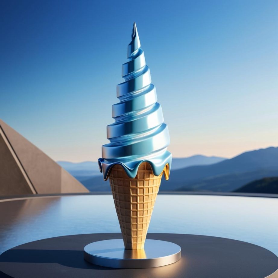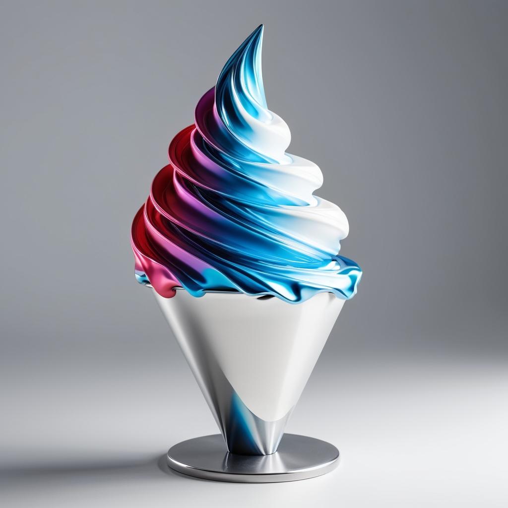 可以将冰激凌甜筒的形象转化为一件具有现代感的雕塑作品。通过使用光滑的材料,如玻璃或抛光金属,来表现冰激凌的光滑质感和甜筒的几何形状。雕塑的色彩可以采用渐变效果,增强视觉吸引力。展现出冰激凌在阳光下的融化感,增加雕塑的动态表现力。整体设计可以强调简洁和形状的对比,使作品在空间中显得活泼而引人注目。