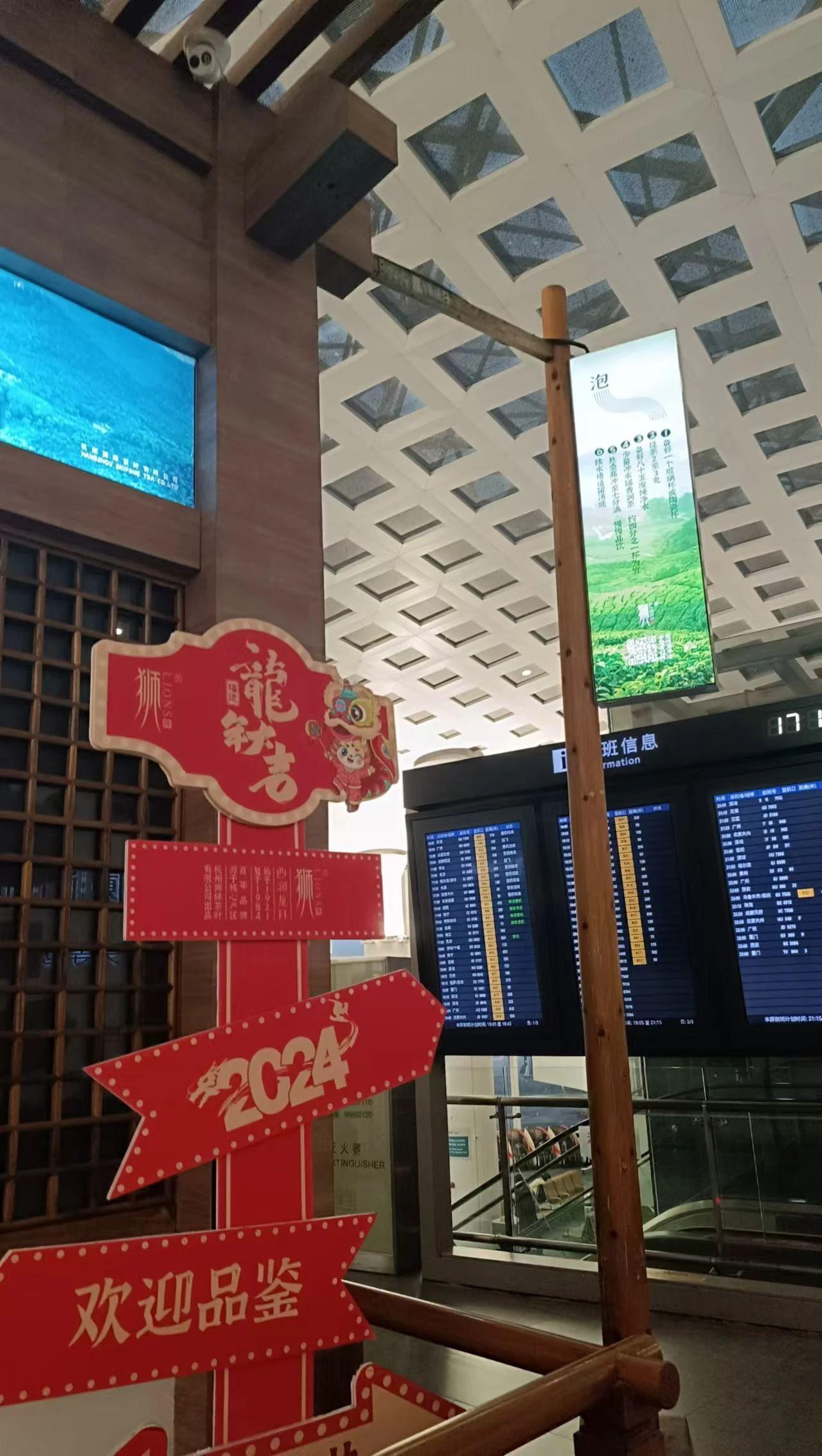 这幅照片展现了一个室内环境,运用了现代建筑中的几何线条与传统装饰元素的对比。天花板的网格设计与其直线结构形成了一个规则的视觉背景,与前景中充满文化色彩的装饰牌形成鲜明对比。光源的引入增加了空间的层次感,红色的装饰牌带来热情与活力,暗示着喜庆的主题,而背景中的信息屏幕提供了现代化的氛围。这种对比不仅增强了画面的视觉冲击力,还传达出传统与现代相融合的故事性。