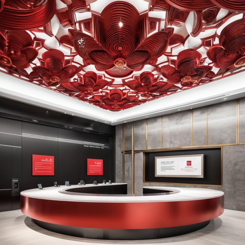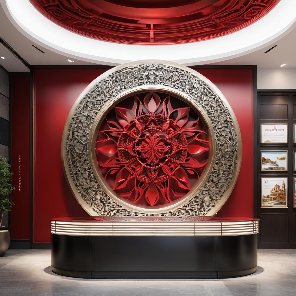 可以将图片中的元素转换为雕塑设计,采用金属与木材结合的方式,表达现代与传统的结合。雕塑的底座可以使用几何网格状设计,以回应天花板的结构,而上部则可采用红色的流线形态,象征装饰牌的喜庆主题。通过使用光滑的金属表面与传统雕刻的质感对比,增强作品的视觉吸引力和文化深度。