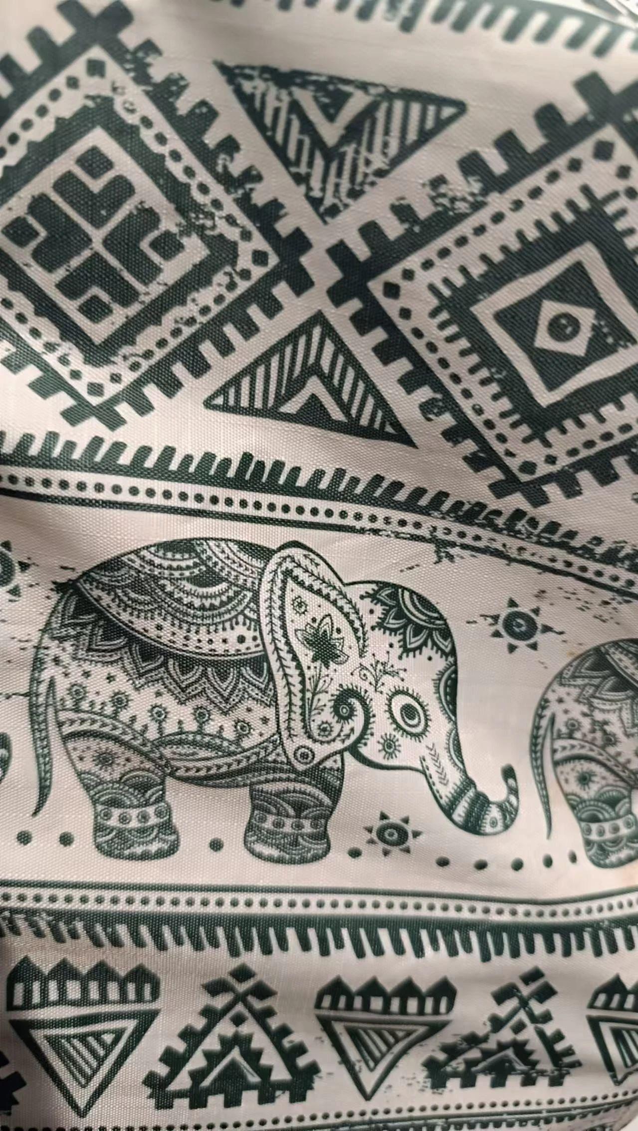 这幅图案展示了一种具有文化象征意义的装饰性设计,中心为精美复杂的象形图案,特别是大象的描绘,象征着力量与智慧。图案中的几何形状和装饰细节如菱形和三角形,形成一种对称的视觉效果,具有强烈的装饰艺术风格。色彩上单一的绿色与背景的对比,使得整个图案具有古典而现代的视觉冲击力。