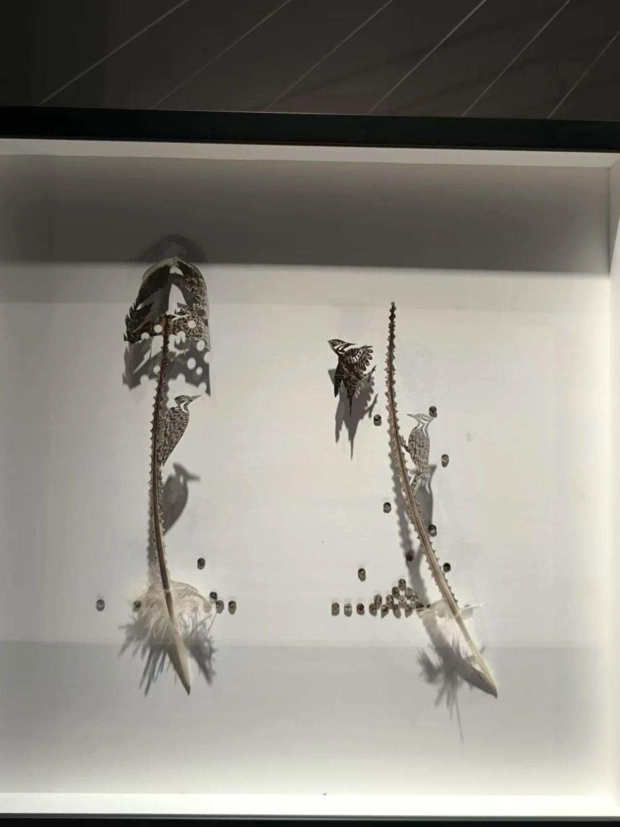 这幅作品展示了在一个浅色背景上的装置艺术,主要元素是两根细长的、具有尖锐形状的物体,上面有复杂的镂空细节。背景的阴影增加了深度和立体感。作品散发出一种自然与人工结合的感觉,可能在探讨自然的脆弱与人类创造力之间的关系。