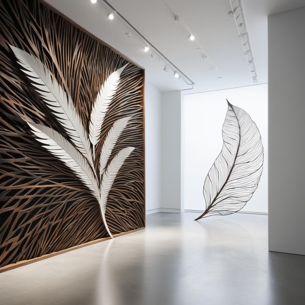 这幅装置艺术作品通过自然形态与人工切割技术的结合,向观众展示了一种独特的视觉体验。作品中的主要元素是两根细长而复杂的形状,类似于树叶或羽毛,它们通过精细的镂空细节展现出自然的脆弱与精致。背景的柔和色调与形状投射的阴影共同营造出一种深度和层次感,使得观者在欣赏作品时感受到一种静谧与思考的氛围。创作者可能在探讨自然与人类创造之间的关系,这种关系通过对比和细节的展示得到了深化。为了进一步提升作品的表现力,可以考虑增加不同材质的结合,例如木材或金属,以增加作品的质感和视觉冲击力。此外,通过背景色调的变化,可以引导观众的视线,使其情感上有更深的共鸣。这样的艺术作品不仅在视觉上吸引人,更在情感和思想上引发观众的反思与共鸣。