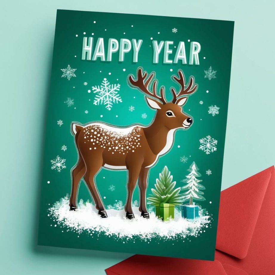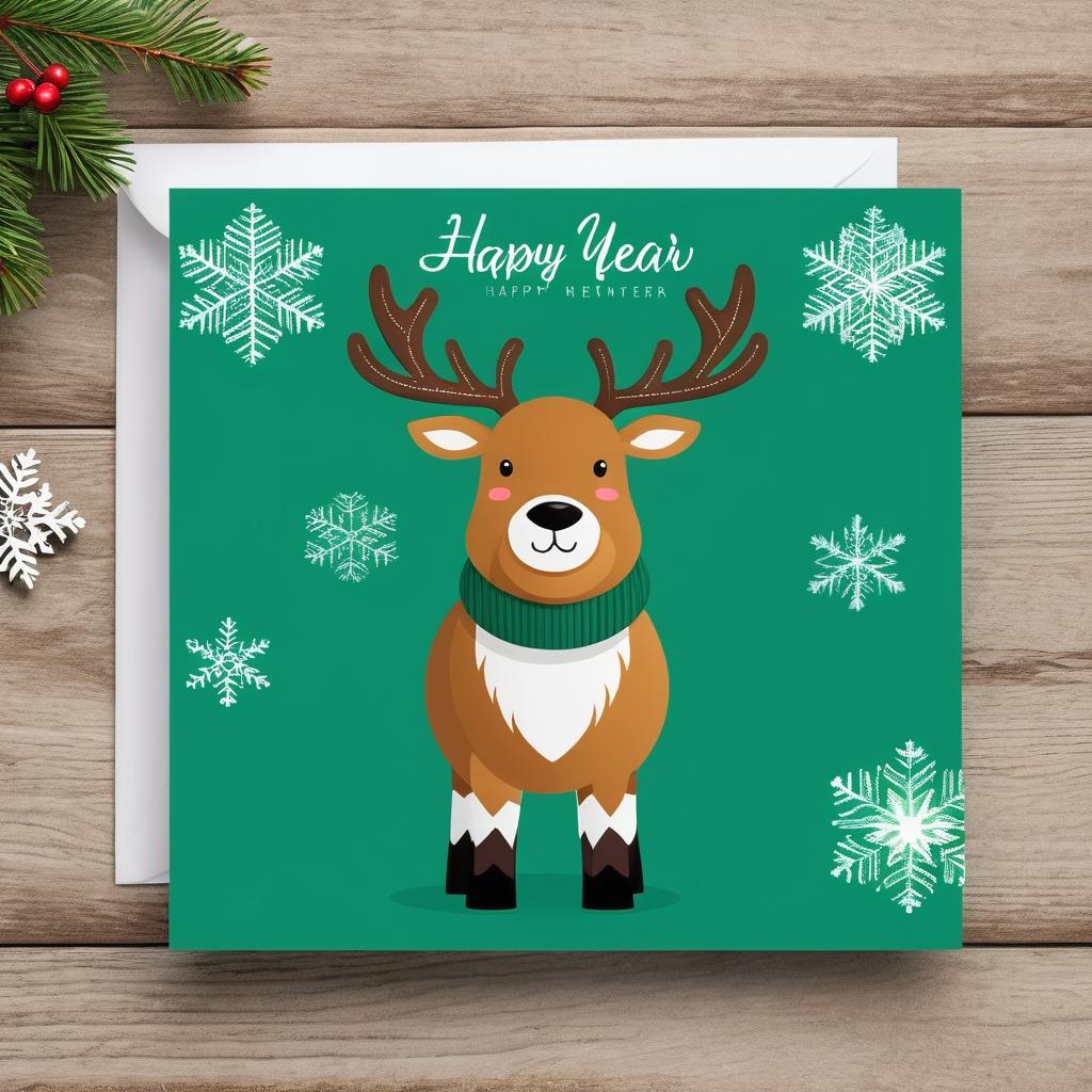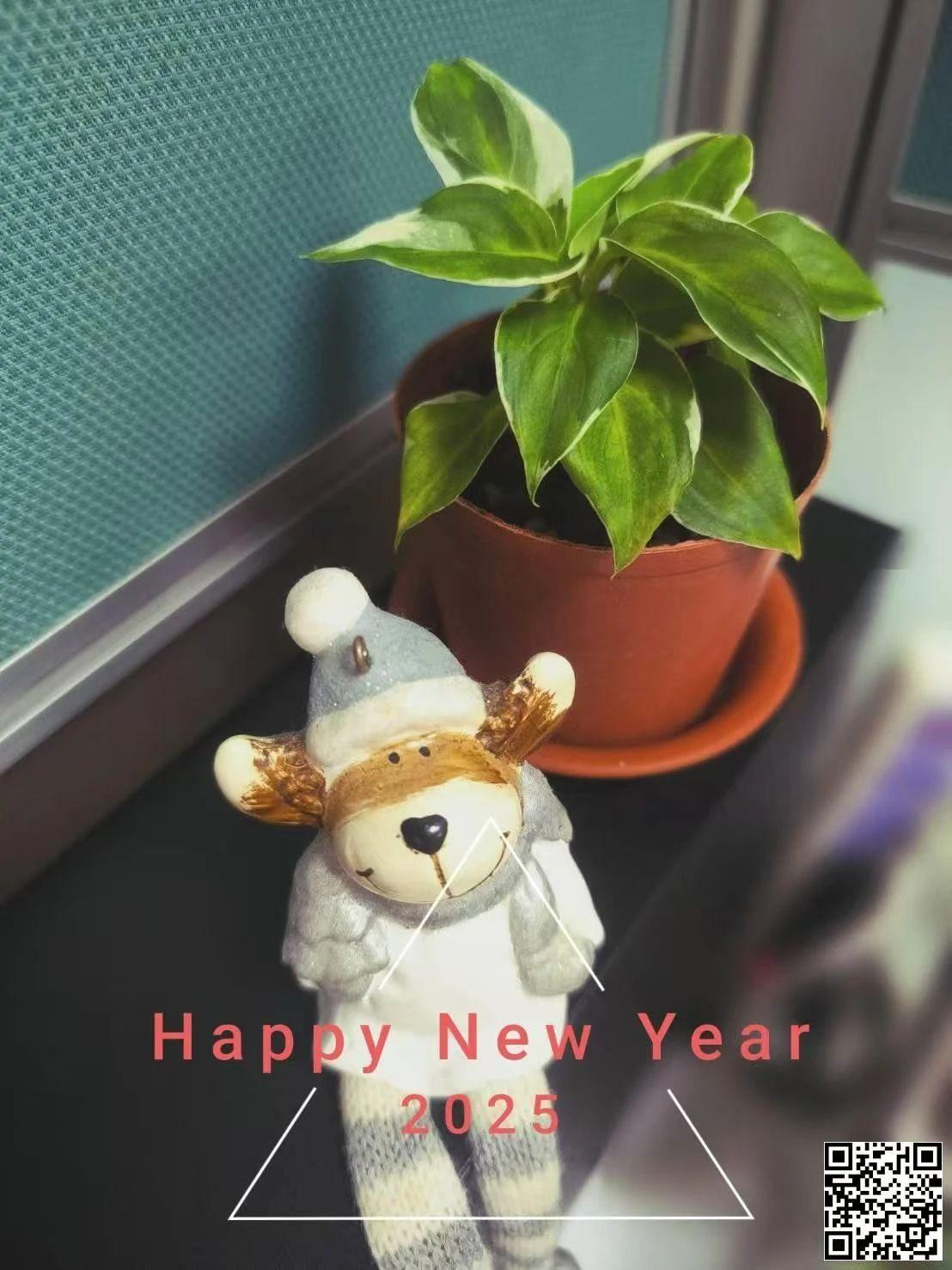 这幅作品中有一个玩具驯鹿和一个绿色植物,背景是一个办公环境。主要颜色是绿色和棕色,给人一种自然和温暖的感觉。画面中有‘Happy New Year 2025’的文字,传达出新年的庆祝和希望。构图简单且温馨,表现出一个充满期待和幸福感的时刻。