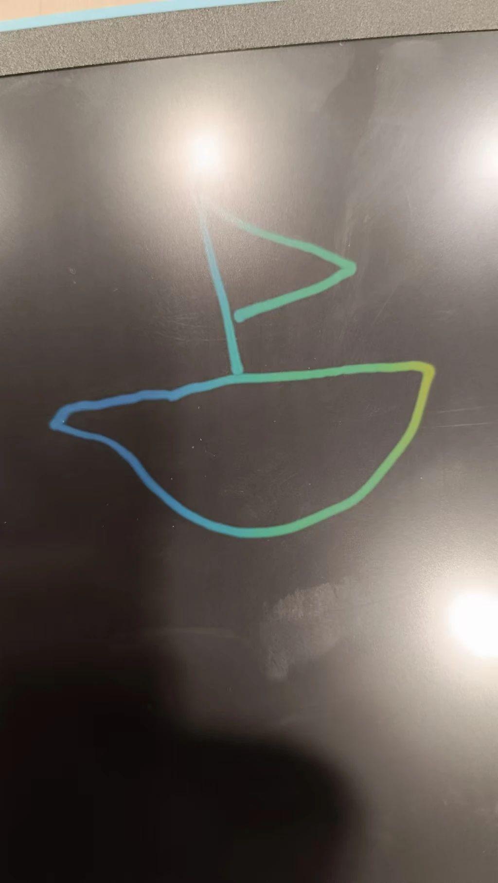 这幅作品以简单的线条和明亮的色彩描绘了一艘船。背景为深色,使得船的轮廓更加突出。船的形状呈现出一种简洁和纯粹的美感,给人一种宁静和轻松的感觉。创作者可能希望通过这种简单的形式语言传达一种纯净的儿童视角。