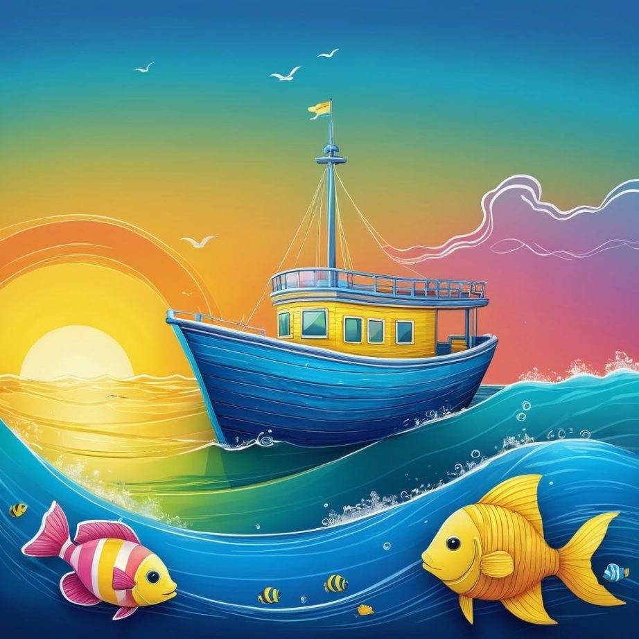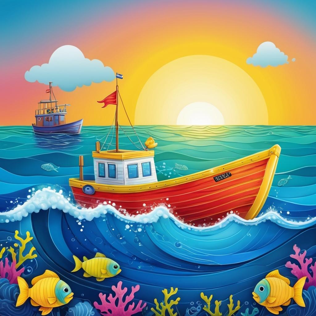这幅画呈现了一幅简单而富有童趣的海上场景。主要元素包括一艘船、波浪、鱼以及一些天空中的元素。颜色鲜艳,使用了蓝色、绿色和黄色,构图简单而直接。整个画面传达了一种轻松、愉悦的情感。
