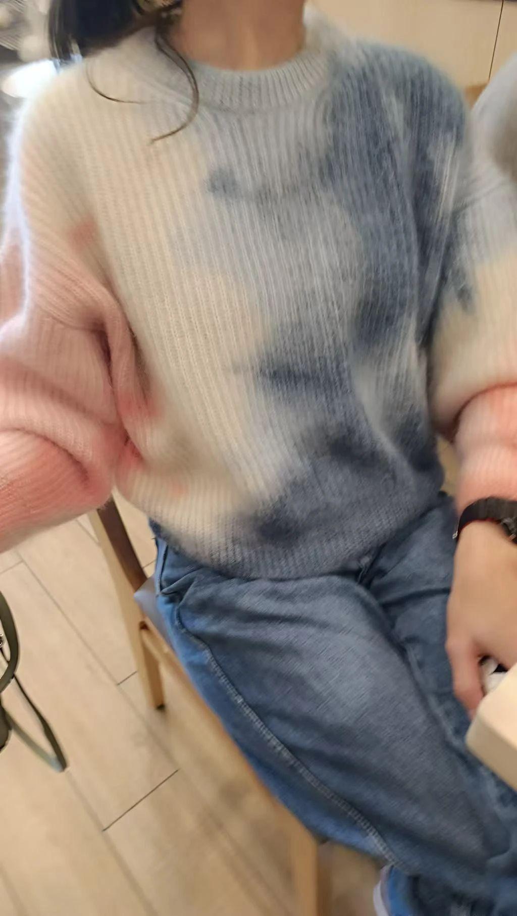 这幅图像展示了一位穿着柔和色调毛衣和牛仔裤的人物。毛衣上的颜色呈现渐变的粉红色和蓝色,给人一种温暖和舒适的感觉。构图上,人物的姿势自然,背景虚化,聚焦于毛衣的质感和色彩。