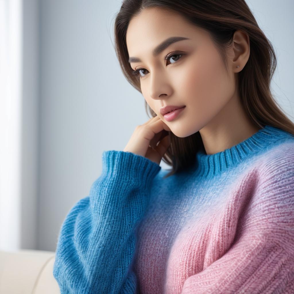 此图像中的色彩搭配和毛衣质感是其主要特色。柔和的渐变色传达出温暖和舒适感,是现代时尚设计中非常流行的元素。可以通过增加细节,例如将背景布置为一个舒适的居家环境,或是添加一些饰品来突出个性化风格,使整体画面更为丰富。色彩上,可以考虑加入一些对比色,增强视觉冲击力。同时,进一步强调材质的质感,例如通过光线的变化提升柔软和蓬松的感觉,从而使作品更具吸引力。