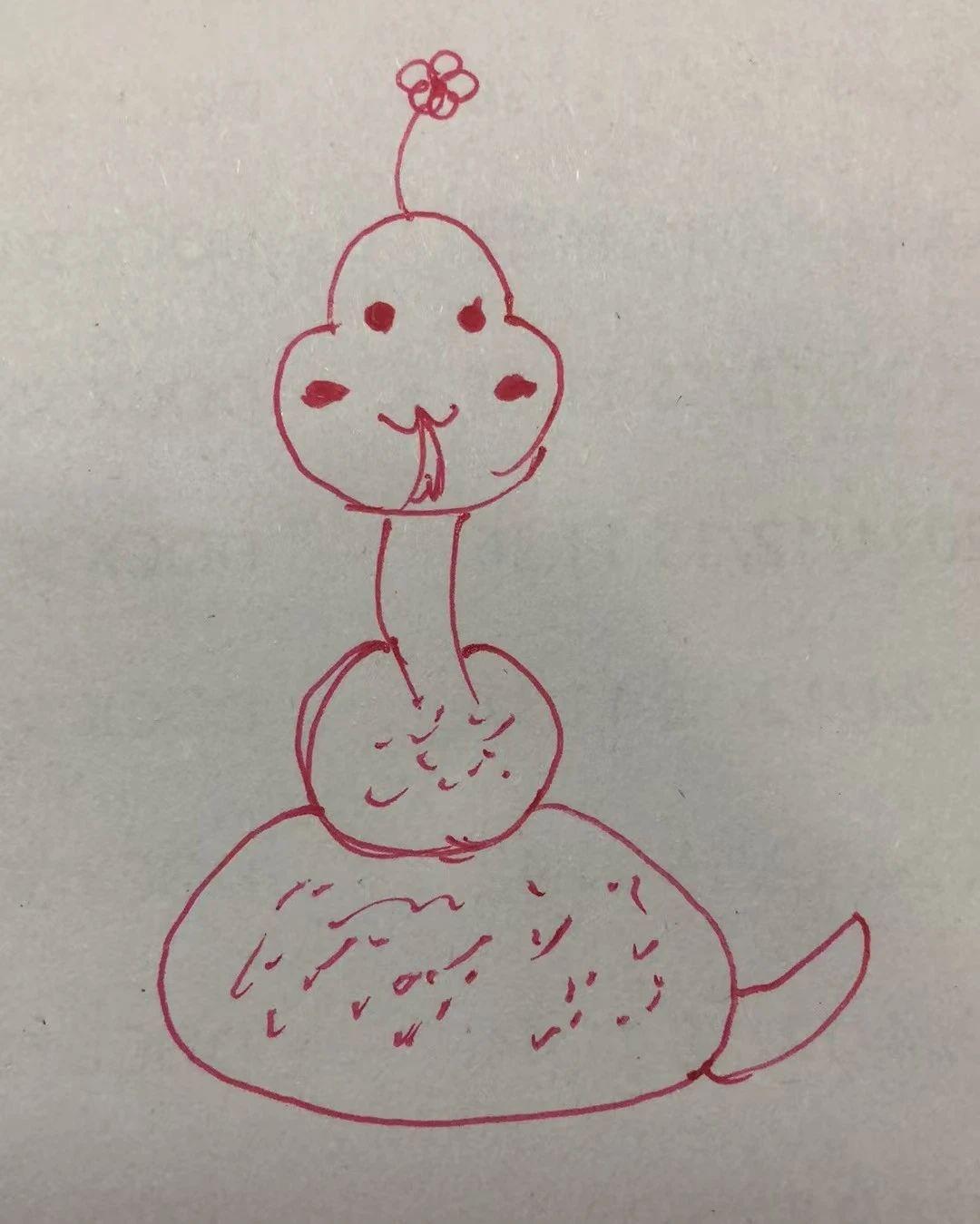 这幅画作使用简单的线条和形状勾勒出一个类似植物的形象,顶部有一个小花朵。整体色调单一,采用红色线条在浅色背景上绘制。作品展现了一种天真和趣味性,可能表达了对自然的童趣幻想。