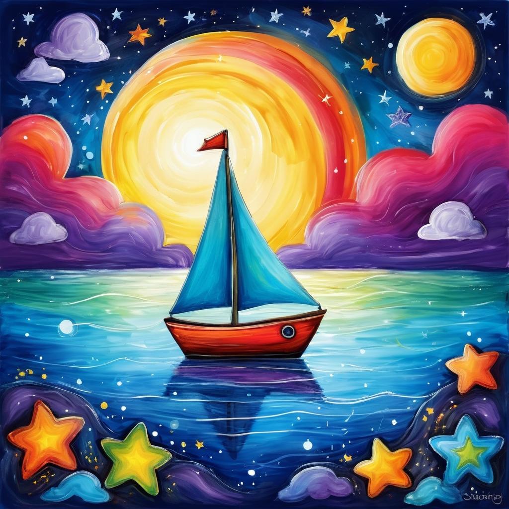 为了进一步提升这幅作品的艺术性,可以考虑加入更多细节,比如在小船上添加一些小动物或人物,这不仅增加了画面的趣味性,也为观者提供了更多的想象空间。此外,通过渐变色彩和光影效果,可以增强画面的立体感,使其更加生动。