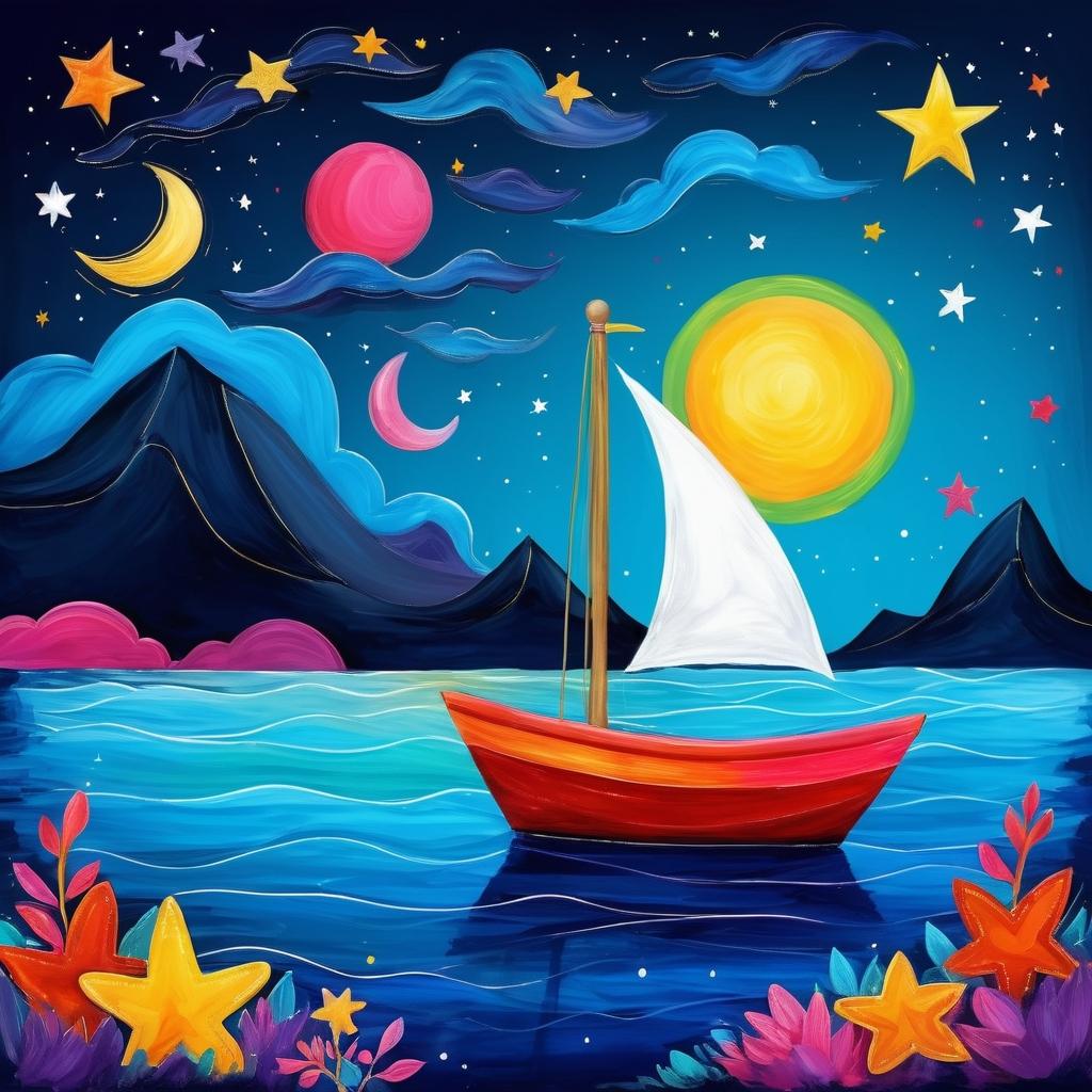 这幅作品充满了童趣和想象力,使用简单的线条和明亮的颜色勾勒出了一幅充满幻想的海上场景。为了提升作品,可以加入更多的细节,比如在船上添加一些小动物或人物,增加故事性。同时,可以通过渐变色彩和光影效果加强作品的立体感。此外,背景的夜空可以通过星星和流星等元素来丰富,使画面更加生动。通过这些调整,作品不仅保持了原有的童趣,还能传达出更深层次的情感和故事。