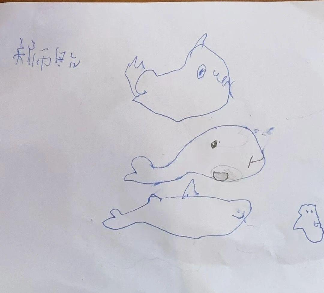 这幅画作是一位年轻艺术家对海洋世界的奇妙探索。通过简单的线条和形状,创作者为我们呈现了三条个性迥异的鱼。每一条鱼都有独特的表情和姿态,仿佛在讲述不同的海洋故事。这种创作方式不仅展现了儿童直观的想象力,也反映了他们对自然界的好奇与热爱。