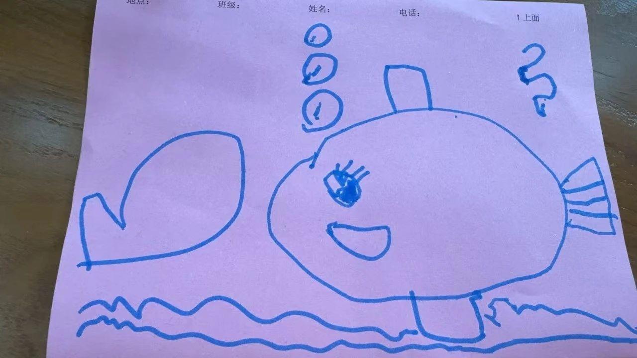 这幅画是一张简单的儿童画,背景为粉色纸张,使用蓝色笔勾勒出一只鱼和一个心形。鱼的表情愉快,周围有几个气泡和波浪线,传达出一种轻松和快乐的氛围。整体构图简单明了,富有童趣。