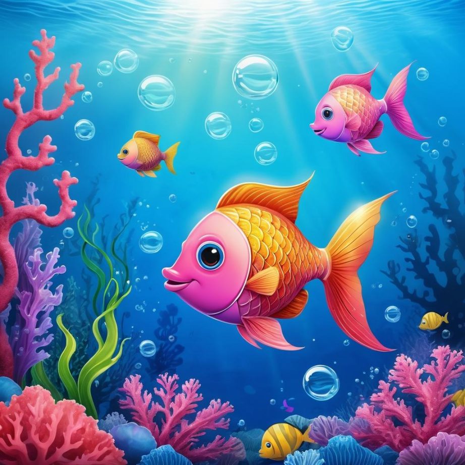 这幅作品以一种简单而直接的方式展现了儿童眼中的海洋世界。鱼的微笑和心形的出现,可能在表达孩童对大自然的喜爱和对生活的热爱。为了提升这幅作品,可以建议增加背景的复杂性,比如加入更多的海洋元素如珊瑚、海草以及其他海洋生物。这将使画面更具层次感和丰富性。此外,可以运用更多的颜色来让作品更加生动,比如在背景中加入渐变的蓝色,模拟海水的深邃感。