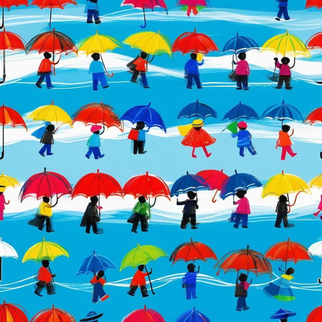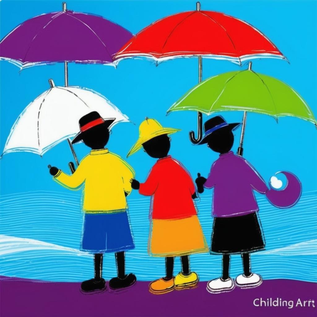 这幅作品由六个不同颜色的简笔画小人组成,每个小人都有独特的姿态与配饰,如雨伞、帽子、盾牌等。颜色鲜艳,构图简单,充满童趣。每个角色似乎在表达不同的情绪或活动,可能传达出多样性和想象力的主题。