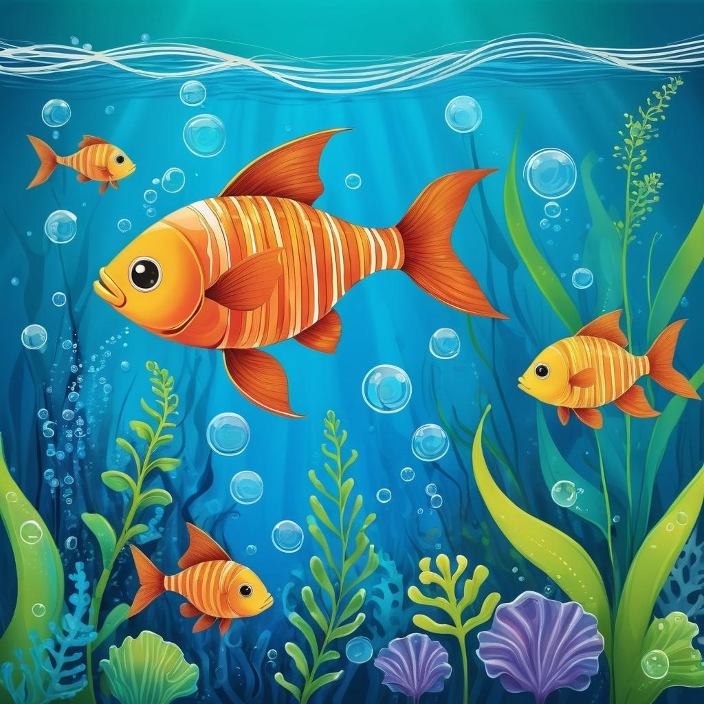 为了提升这幅作品的艺术性,我们可以鼓励孩子们增加更多的细节。比如,添加其他的海洋生物,或者通过颜色的变化来表现水的流动和光影的变幻。此外,加入一些简单的情节,如鱼与其他生物的互动,可以给画作增添生动的故事性,使其更具吸引力和情感共鸣。