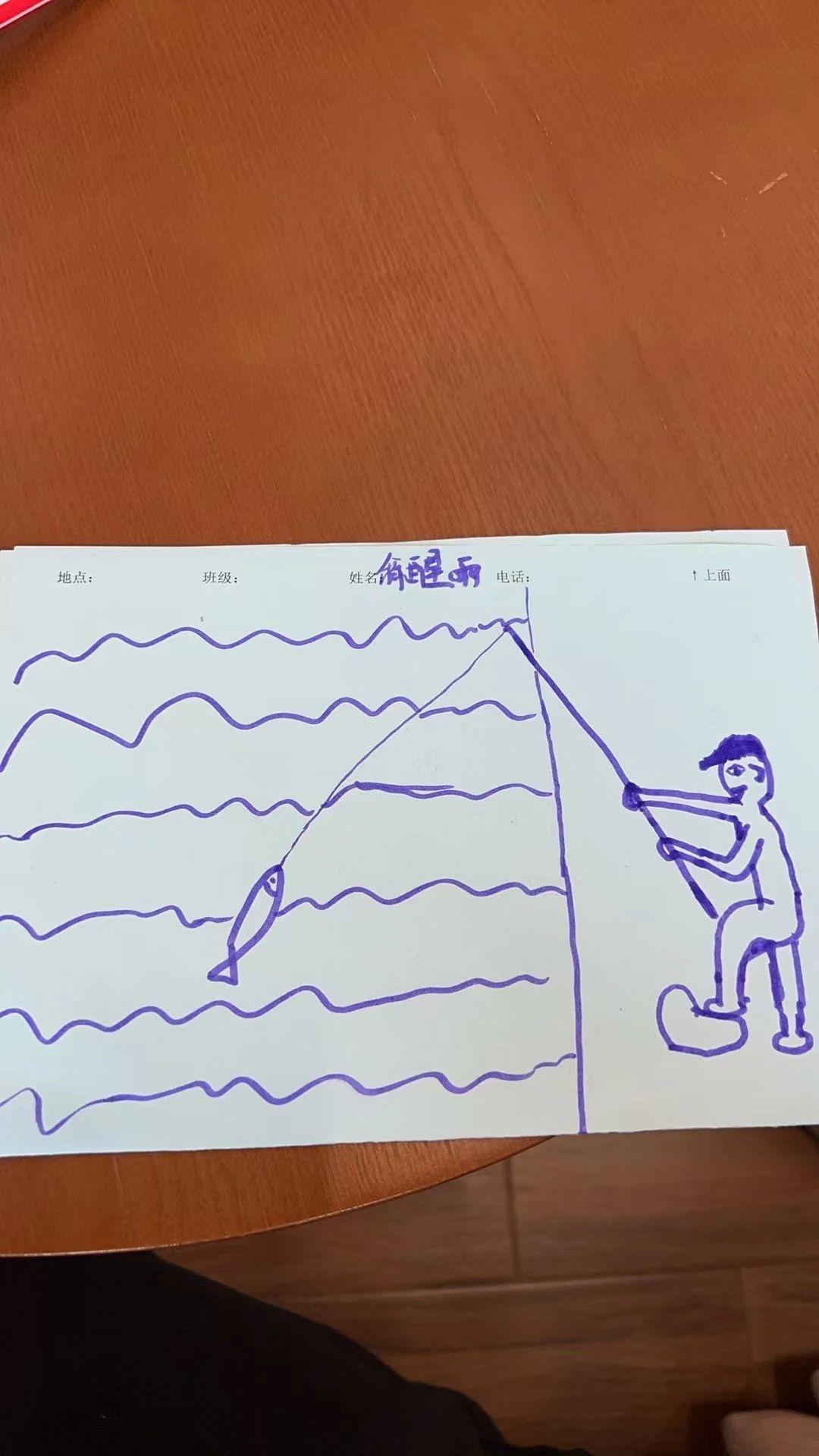 这幅作品展示了一个孩子眼中的钓鱼活动,充满了童趣。简单的线条和单一的颜色使用,体现了孩子在表达世界时的直接与纯真。为了提升这幅作品,可以考虑加入更多的细节,如水中的波光、天空的颜色变化,或者在钓鱼者的表情上增加更多细节,以增强情感表达。同时,可以尝试使用多种颜色来丰富画面,使其更加生动。在构图上,可以通过增加背景元素,如树木、船只或其他钓鱼者,来增强场景感和深度。