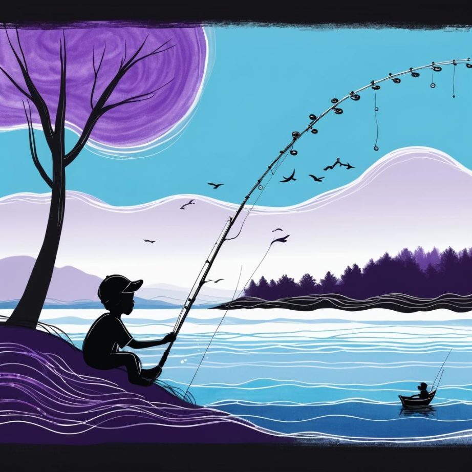 这幅作品采用简单的线条和单一的紫色,描绘了一个人在钓鱼的场景。画面左侧是波浪形的线条,表现了水面,而人物站在画面右侧,手握钓竿,竿的另一端则有一条鱼。整个构图简洁明了,传达了一种轻松的氛围。