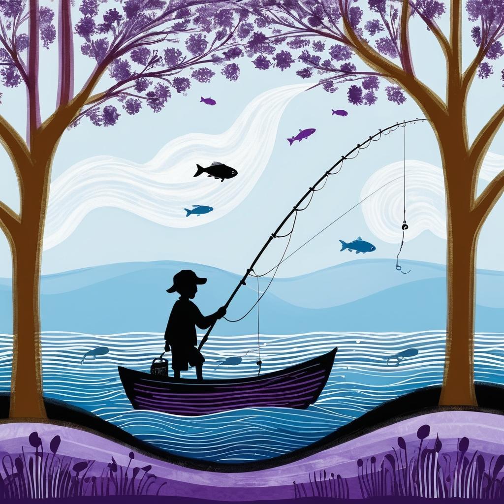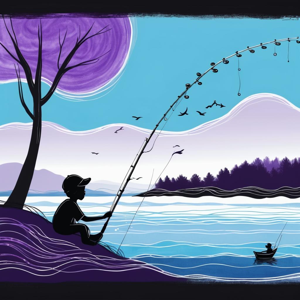 这幅画作以一种纯真的视角呈现了钓鱼的场景。简单的线条和单一的紫色使整个画面显得清新而直接,让人仿佛能看到孩子们在他们的小世界中如何观察和表达。画中的人物专注于钓鱼,这种专注感通过人物的姿势和钓竿的倾斜传达出来,虽然简单却极其有效。为了使这幅画作更具深度,我们可以考虑加入更多的细节。例如,在水面上添加波光粼粼的效果,或者在天空中加入不同层次的颜色,以表现时间的流逝或天气的变化。此外,可以通过增加钓鱼者的表情细节来增强情感的表达,使观者能够更好地感受到钓鱼者的心情。背景元素的引入,如树木、船只或其他钓鱼者,不仅可以丰富画面的层次感,还能为作品增添更多故事性。这样一幅画,不仅能保持其原有的童趣,还能在视觉和情感上给人以更大的冲击。
