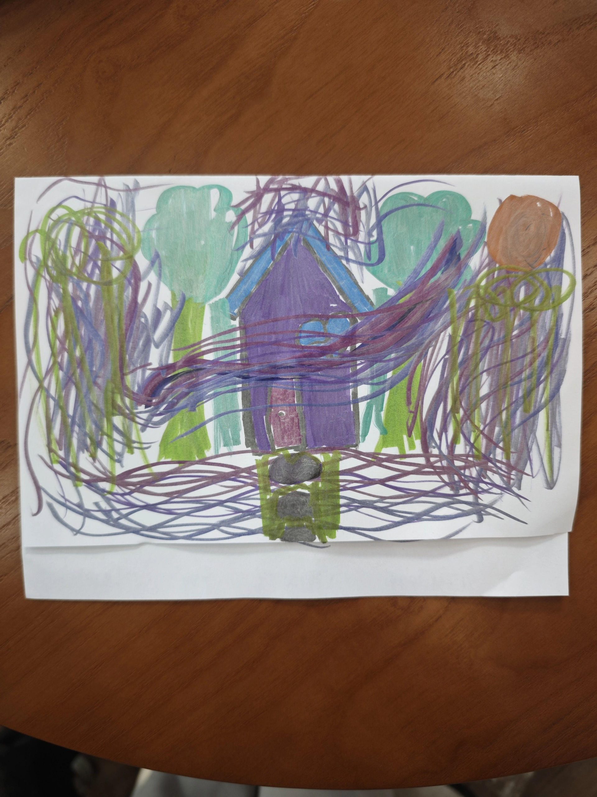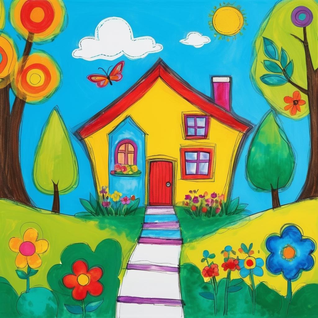 这幅作品使用了丰富的色彩和自由的线条,展现了一个简单的房屋和周围的树木。整体构图充满童真和活力,颜色的搭配传达出一种自然和谐的感觉。创作者可能在表达一种对自然和家园的想象。