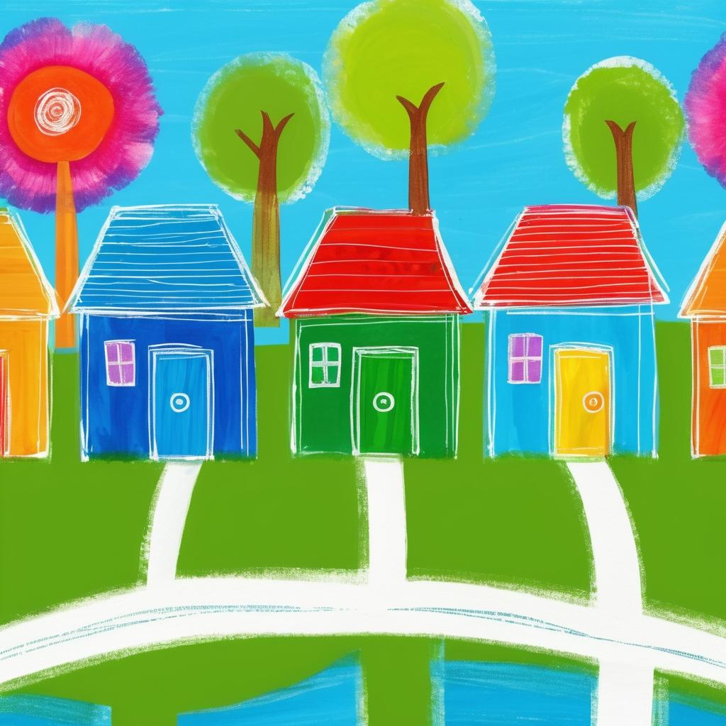 这幅画作展现了孩子们对世界的纯真想象。简单的房屋和树木以生动的色彩和自由的线条呈现,仿佛在描绘一个充满活力的童话世界。这样的作品不仅仅是色彩的组合,更是孩子内心世界的表达。通过这种方式,孩子们能够将他们对自然和家的理解形象化,传达出一种宁静和谐的氛围。
