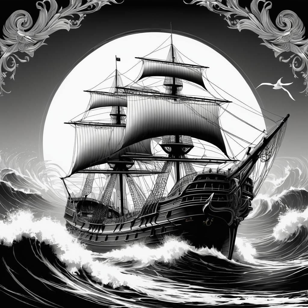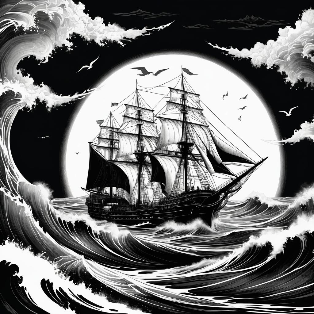 这幅作品的核心在于其简洁而富有表现力的线条。为了提升其艺术表现力,可以考虑在背景中加入更多元素,如远处的地平线或岛屿,增加场景的深度和故事性。此外,可以尝试在船只和海浪的线条中融入一些颜色,以突出其戏剧性。可以利用光影效果来强调船只的立体感,营造出一种光影交错的氛围,使画面更具视觉冲击力。通过这些改进,作品可以更好地展现出航海冒险的浪漫与神秘。