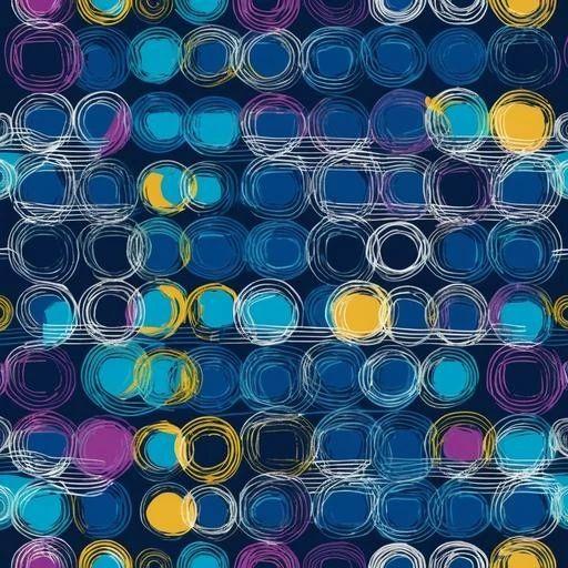 这幅作品充满了活力与动感,通过大量圆形图案的重复与变化,形成了一种韵律感。线条的随意性与颜色的大胆运用,尤其是深蓝、紫色与黄色的搭配,营造出一种现代而富有冲击力的视觉效果。整体构图虽然看似无序,但通过颜色的深浅对比与线条的密集度变化,呈现出一种微妙的平衡。作品传达了一种轻松愉悦的情感,同时也具有一定的神秘感。