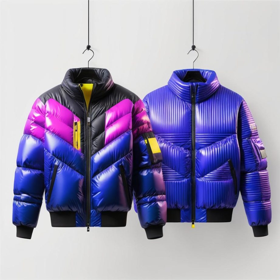 这幅作品中的圆形及其色彩组合为羽绒服设计提供了丰富的灵感。可以将这些圆形图案转化为羽绒服的印花设计,利用不同尺寸的圆形元素排列出富有节奏感的图案,成为羽绒服的独特标志。在色彩方面,可以选择深蓝色作为羽绒服的主体色,搭配紫色和黄色的点缀,增强视觉冲击力。线条的随意感可以通过缝线的设计来体现,增加羽绒服的层次感与立体感。同时,面料的选择上可偏向光泽感较强的材料,增强现代感与时尚感。