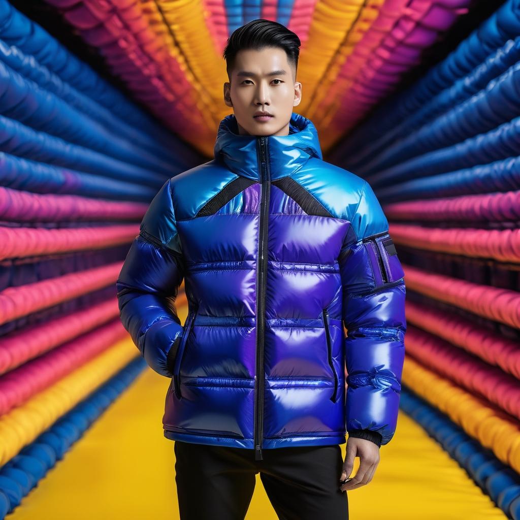 这幅作品以其富有节奏感的圆形图案和大胆的色彩组合引人注目,深蓝、紫色和黄色的搭配创造出一种现代而充满活力的氛围。通过对这些元素的分析,我们可以看到设计师如何巧妙地运用线条和色彩来传达轻松与动感的情感。这样的艺术特征为羽绒服设计提供了丰富的灵感来源。在设计中,可以将这些圆形图案和色彩组合应用于羽绒服的印花和配色上,增强服装的视觉吸引力和时尚感。结合现代设计理论,这种图案不仅仅是美学上的创新,更是对现代生活方式的一种诠释,体现出功能与艺术的完美结合。通过这种方式,羽绒服设计不仅仅是为了保暖,更成为一种情感表达和艺术表现的载体。